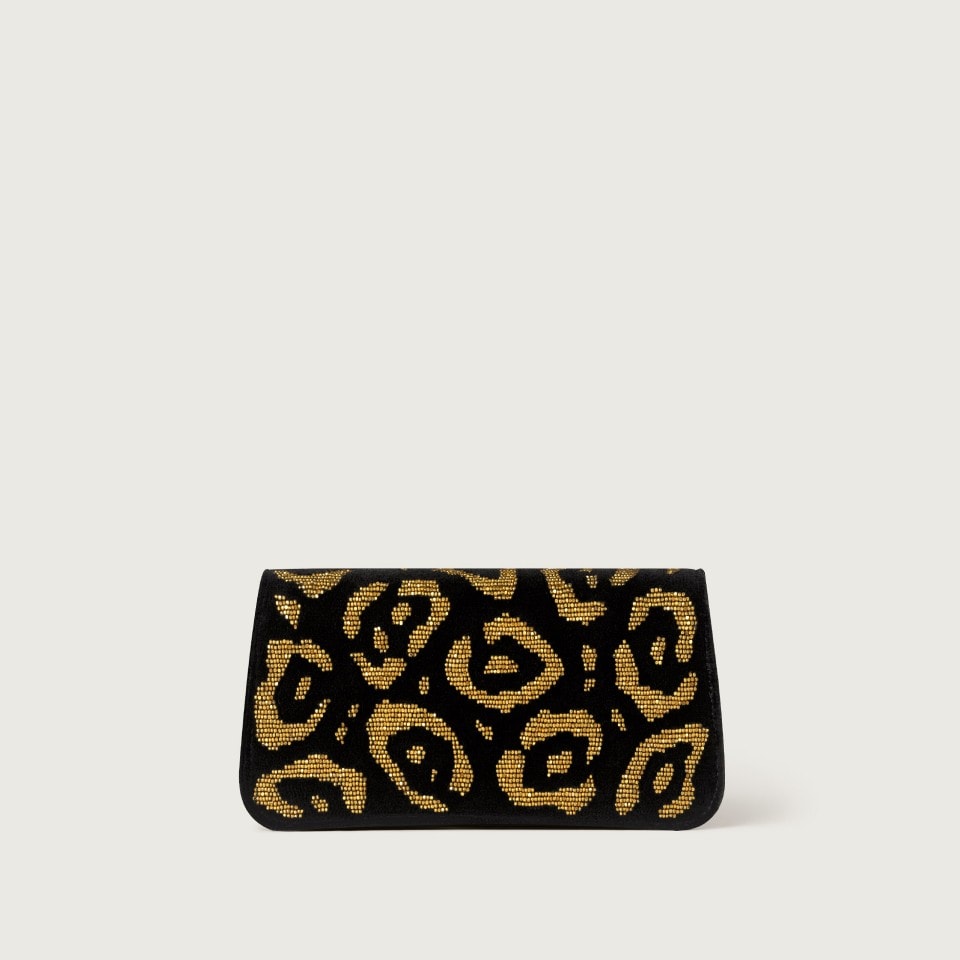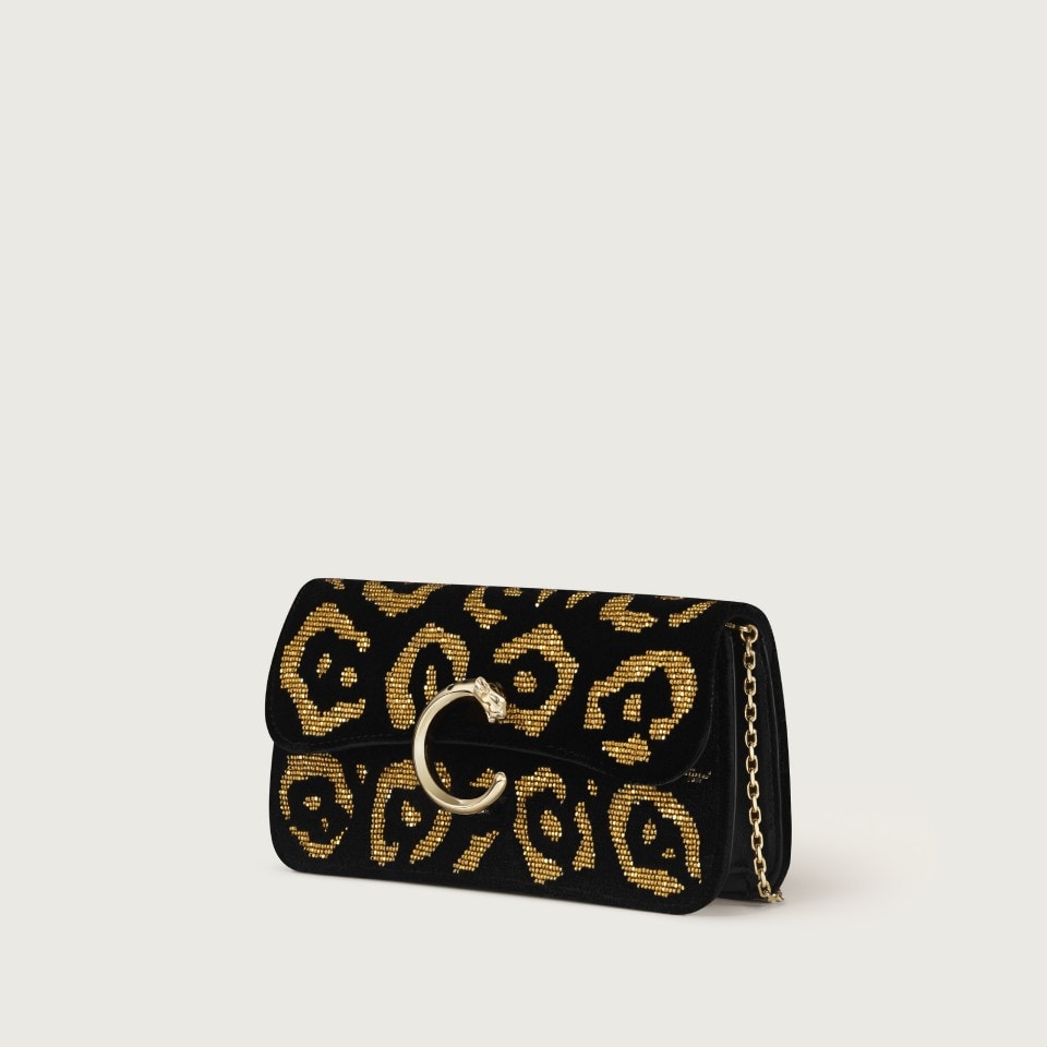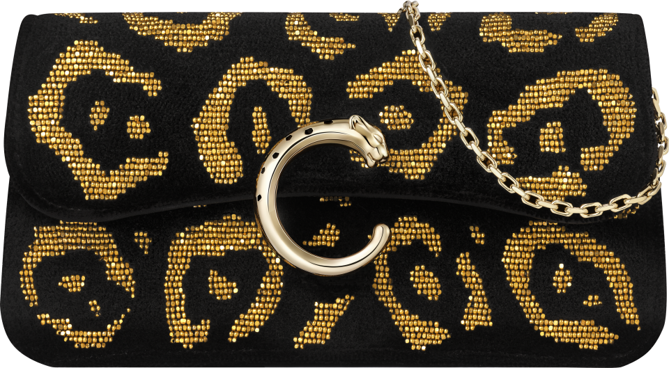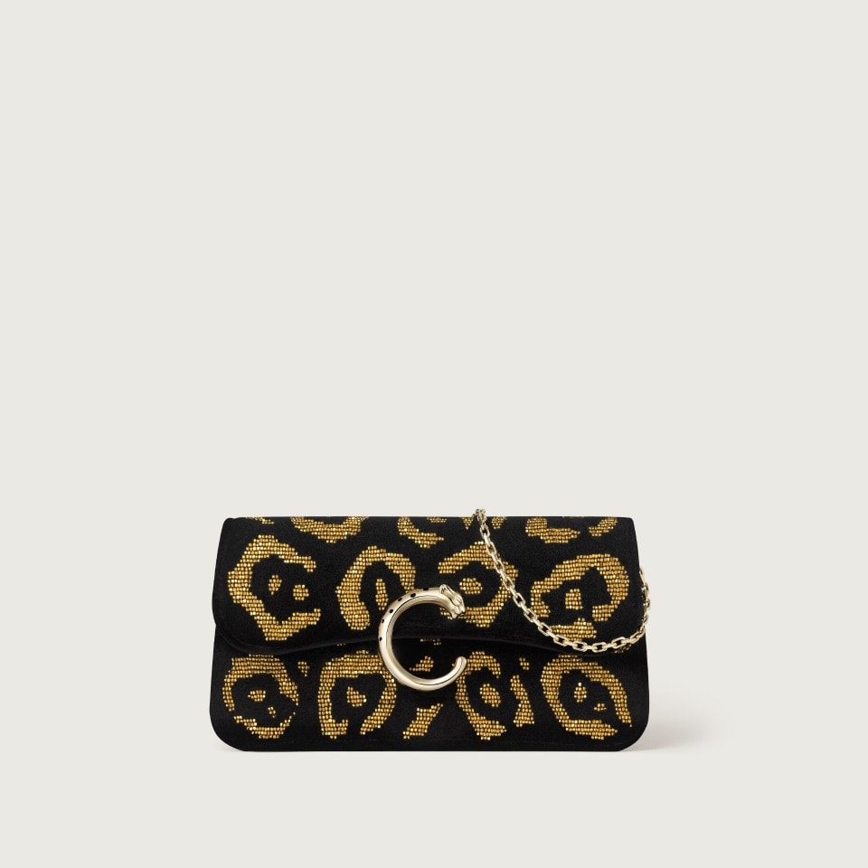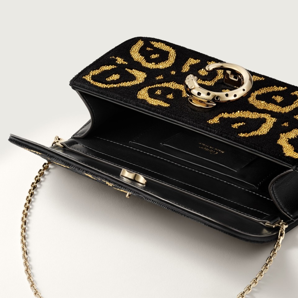Minimodel tas met ketting, Panthère C de Cartier, zwart tuftwerk met geborduurde gouden kralen met pantermotief, sluiting van zwart email met goudkleurige afwerking, goudkleurig hot-stamped Cartier-logo aan de binnenkant. Eén binnenvak, één plat vak en één vak met logo. Eén extern plat vak aan de achterkant. Voering: zwart lamsleder. Afneembare ketting. Afmetingen: Hoogte: 100 mm. Lengte: 200 mm. Diepte: 45 mm. Kan in de hand en crossbody worden gedragen.