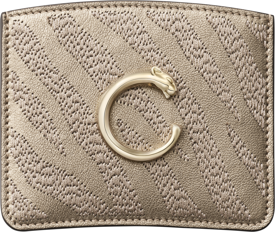 Panthère C-kaarthouder van goudkleurig metallic lamsleder met geborduurd goudkleurig katachtig motief, Panthère-logo met goudkleurige afwerking. Binnenkant: zwart lamsleder, één groot centraal insteekvak, drie kaartsleuven aan de achterkant, goudkleurig hot-stamped Cartier-logo.