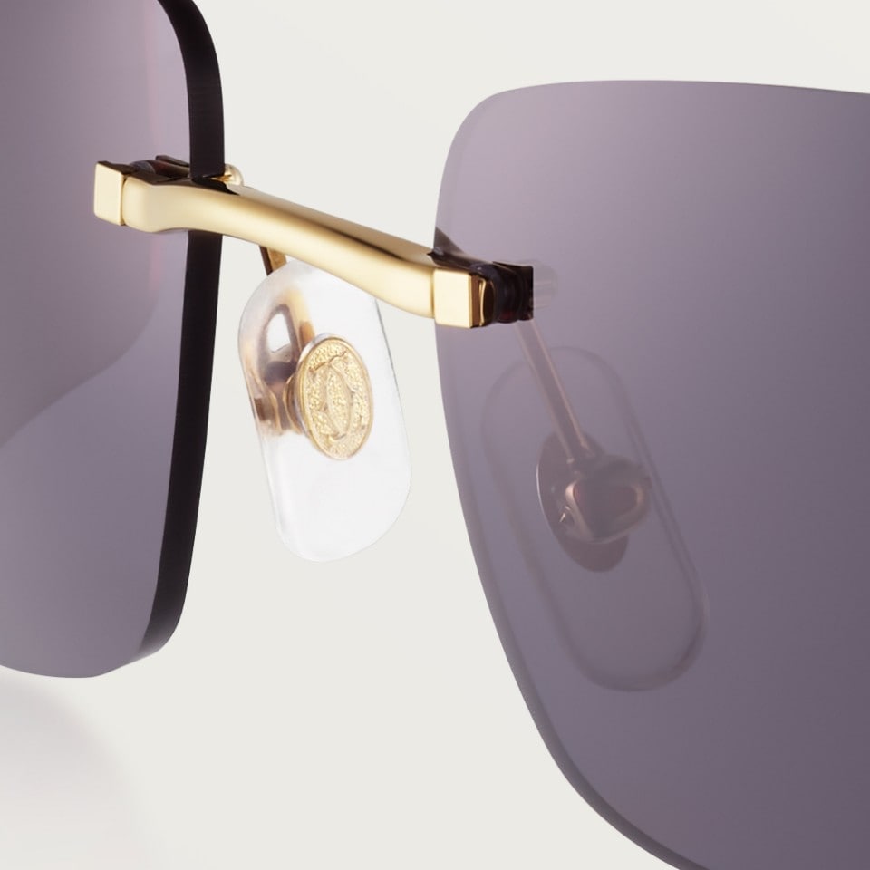 Óculos de sol Panthère de Cartier, metal sem armação, acabamento dourado liso, forma retangular e lentes cinzentas. Dimensões: Lentes de 71 mm, ponte de 18 mm, hastes de 115 mm.