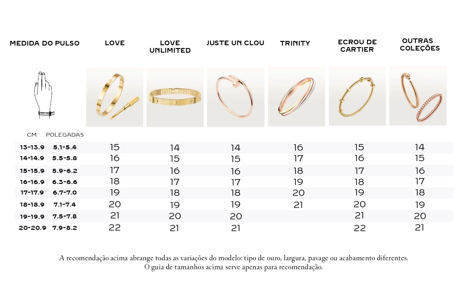 O tamanho das nossas criações Cartier varia consoante a coleção. Encontre todos os tamanhos de pulseira na nossa tabela de recomendações: