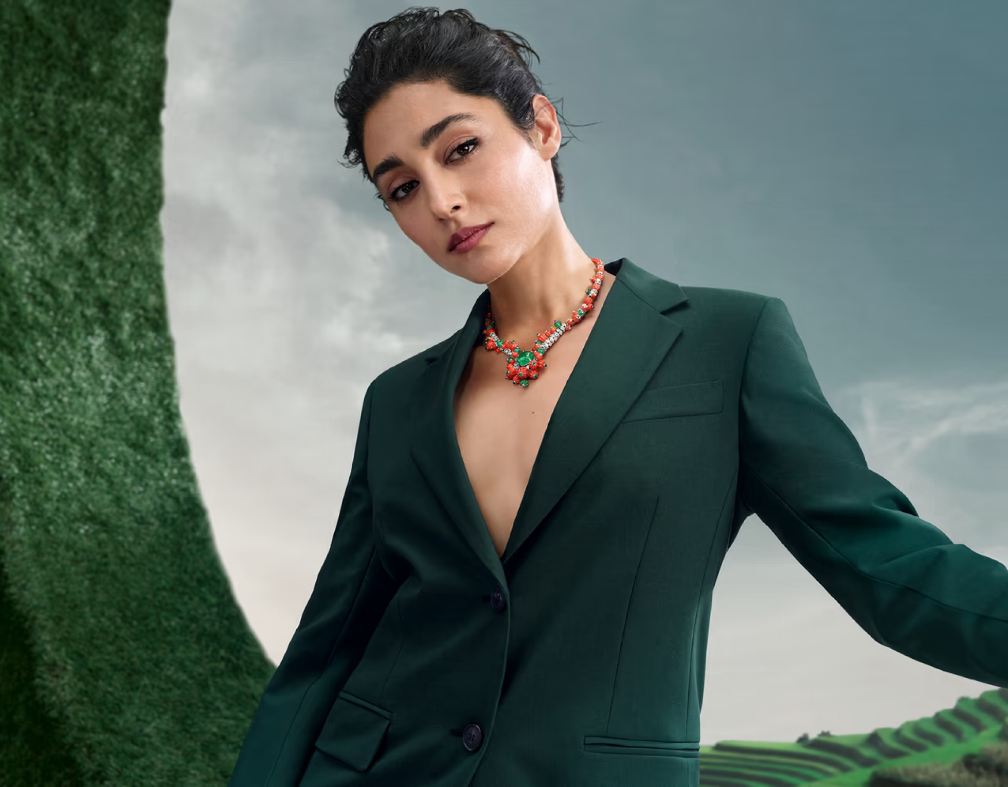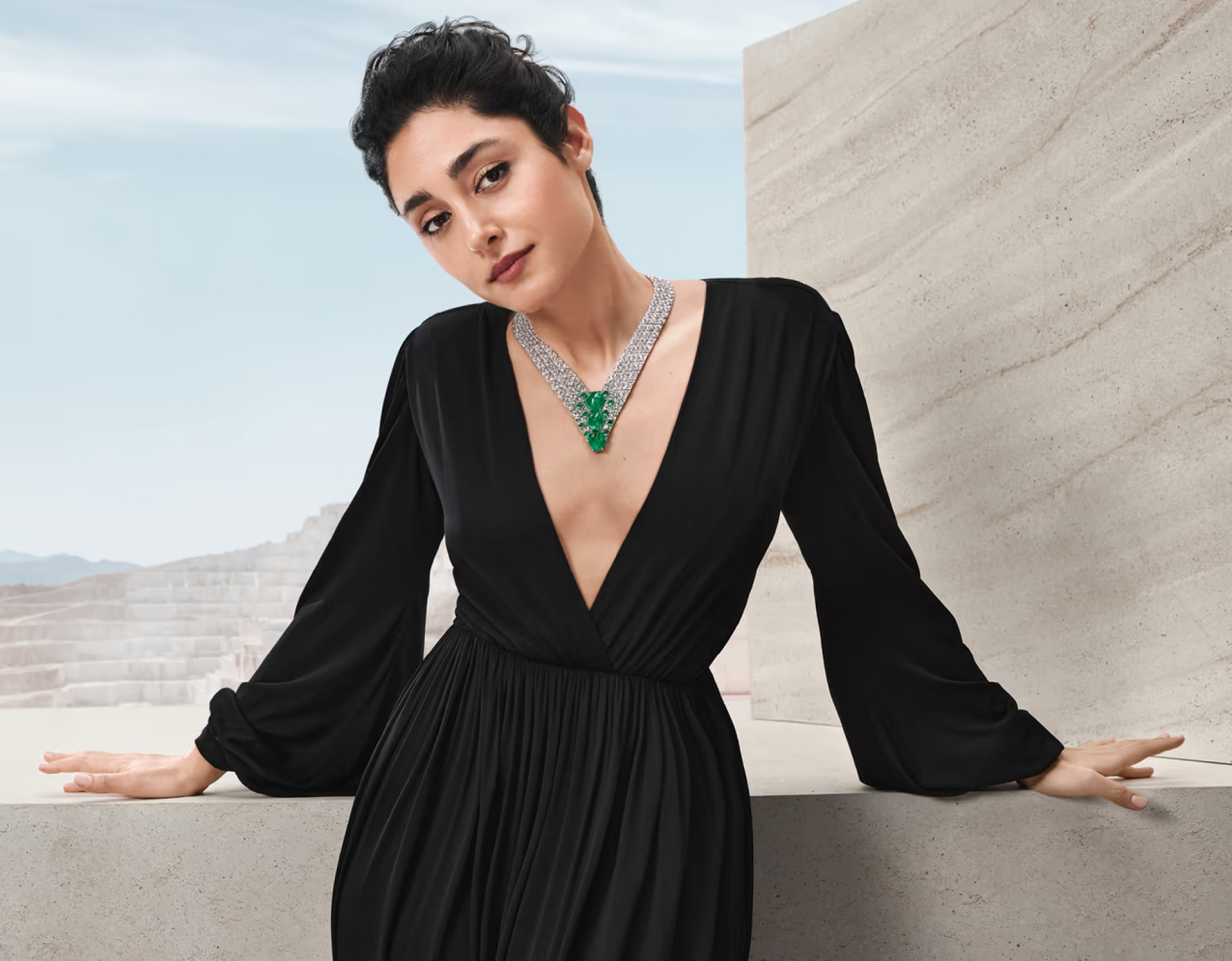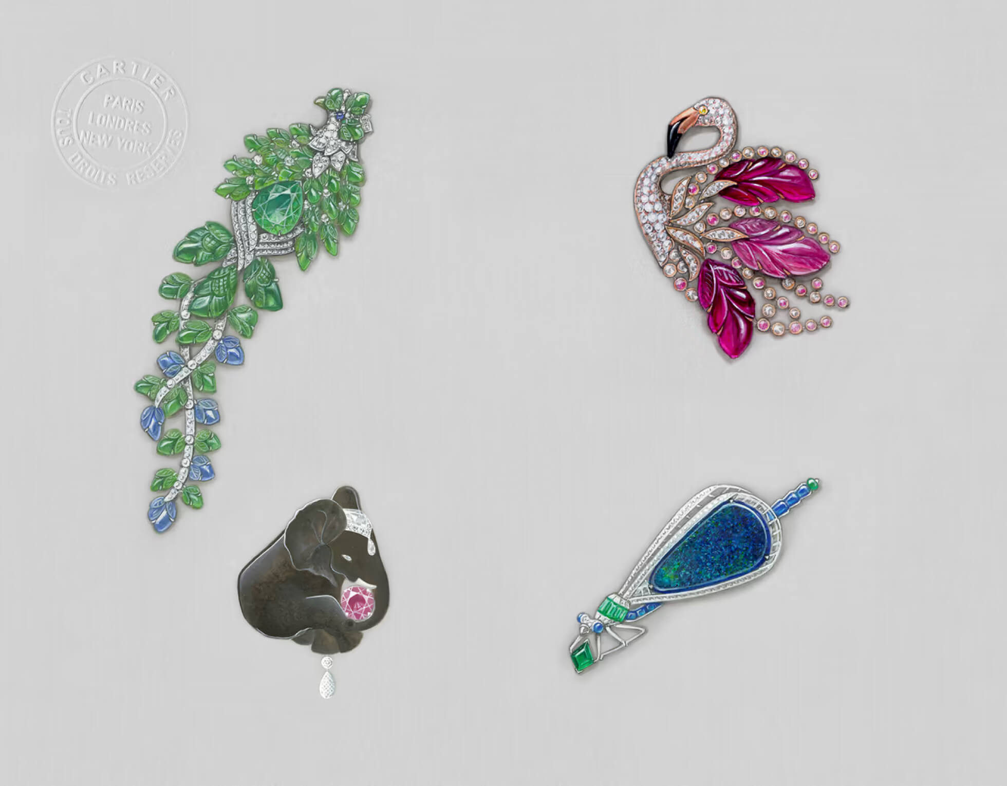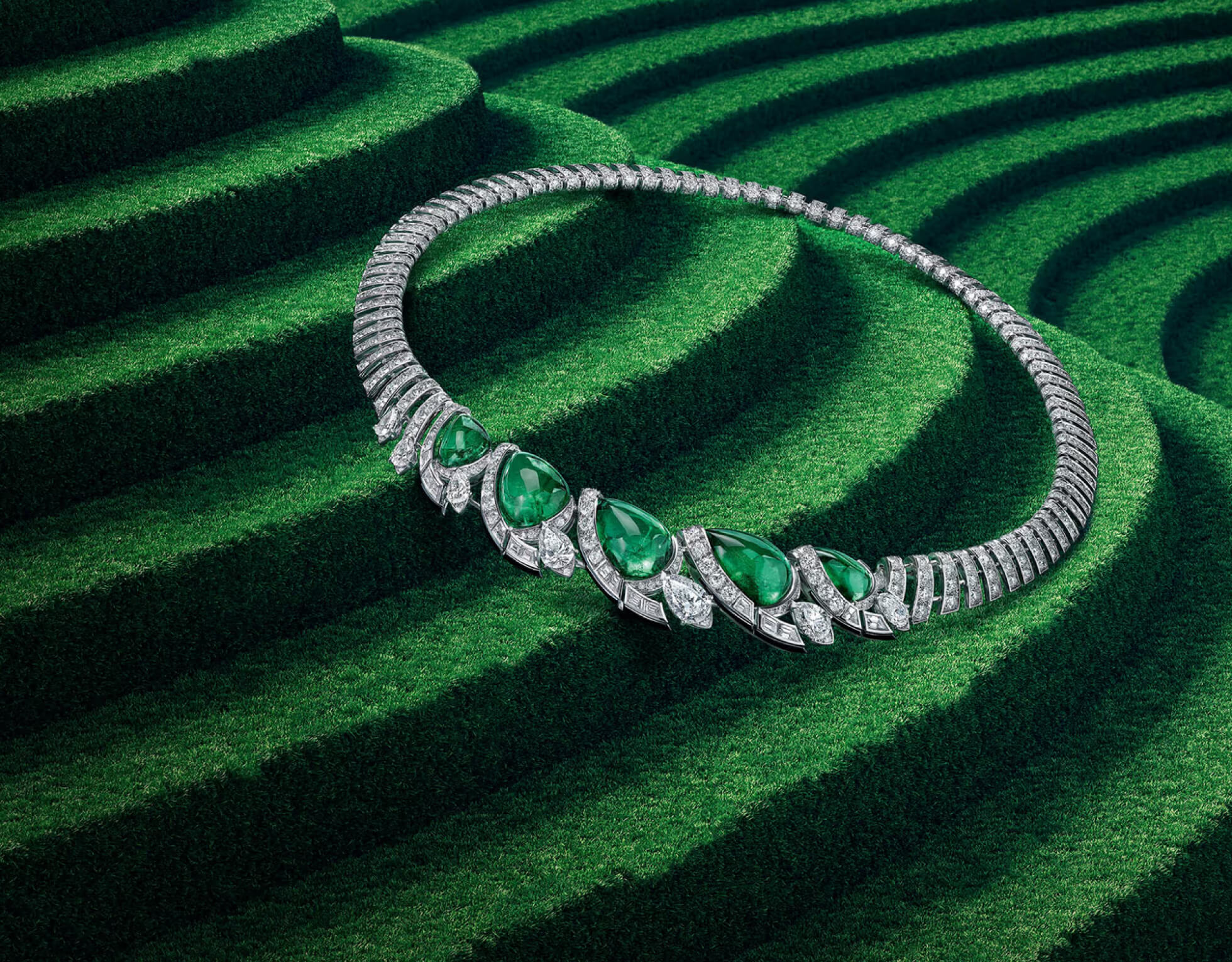 Cartier видит в совершенстве природы жизнь и движение. Абстрактным мотивом короткого колье, выполненного из ансамбля пяти замбийских изумрудов весом 42,44 карата, становится птичье оперение. Каждый драгоценный камень подчеркнут изгибом квадратных бриллиантов, обрамленных ониксом специальной огранки, который в конце завершает бриллиант грушевидной огранки. За этой ритмичной композицией скрываются два ювелирных достижения: гибкость колье достигается за счет использования невидимых соединений, а изумруды словно возвышаются над бриллиантовыми перьями благодаря оправе без крапанов.