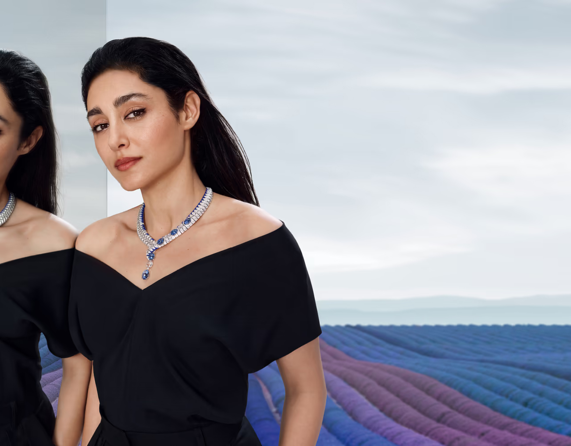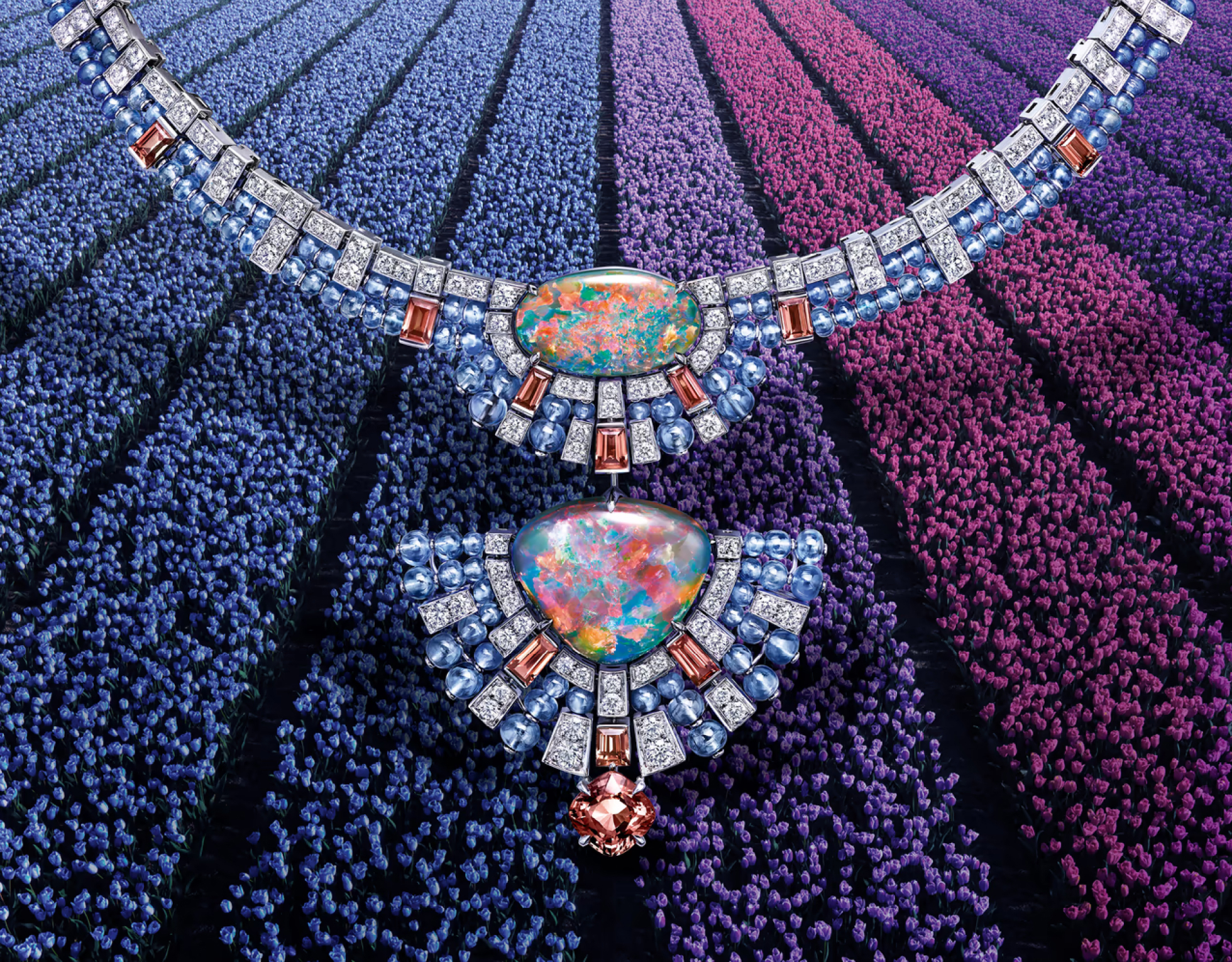 Внимательно посмотрите на крыло бабочки, позвольте себе быть ослепленным красотой его оттенков и представьте себе украшение, которое отражало бы его переливающуюся красоту. Это ожерелье родилось из наблюдения за бесконечно малым. Здесь речь идет не о фигуральном воспроизведении, а о том, чтобы через абстрактную композицию предложить отображение мерцающих цветов, вызывающих представление о нежнейшем насекомомом.