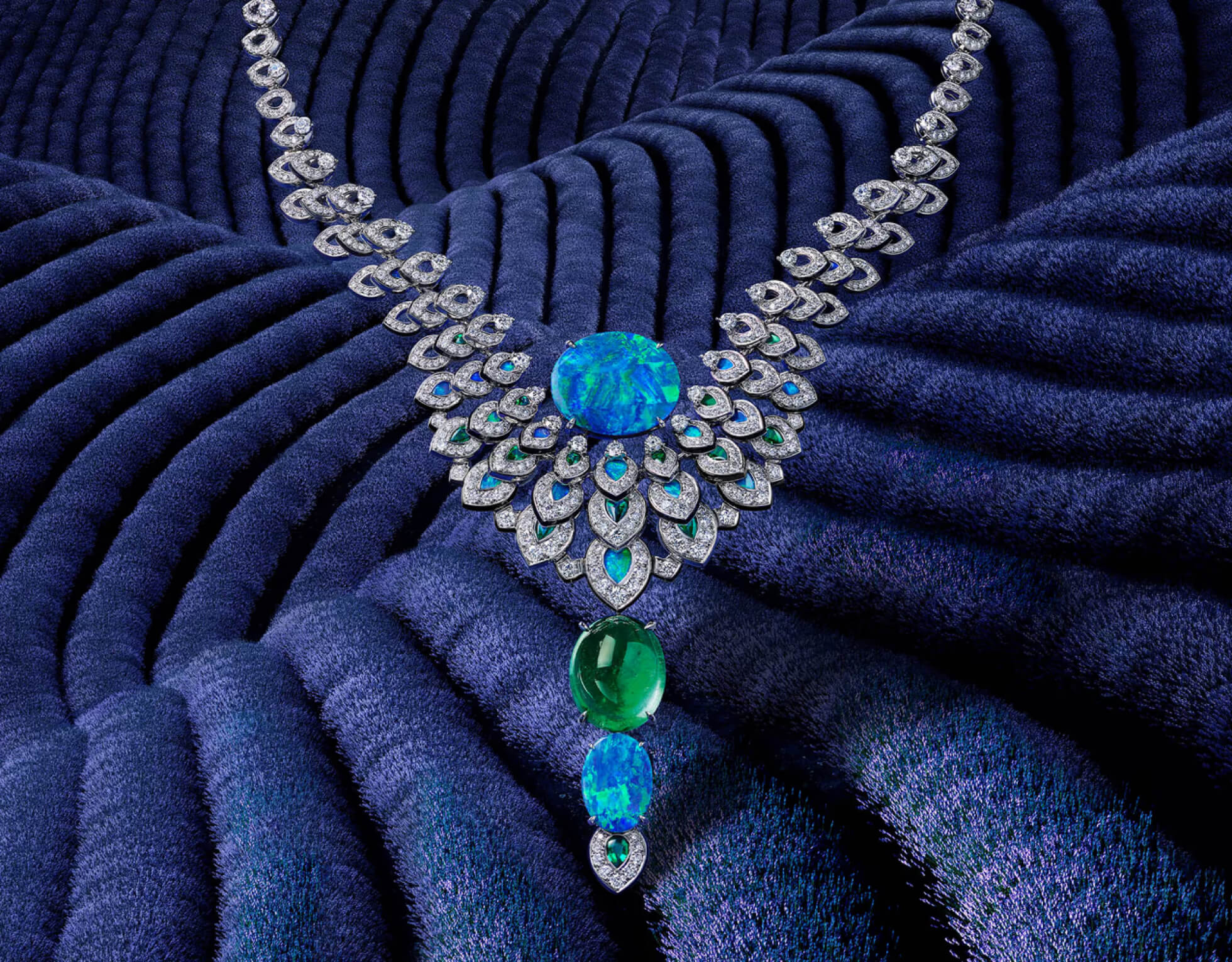Павлин — одна из самых очаровательных птиц. Колье Ocelle с двумя опалами весом 16,59 и 6,19 карата соответственно и замбийским изумрудом весом 21,18 карата в качестве подвески посвящено этой птице. Миниатюзированные «глазки» — знаменитые пятна в оперении павлина — обрузуют стилизованную графическую композицию. Каждый элемент обрамлен отделкой из оникса. Маленькие перья частично перекрывают друг друга, но в то же время остаются подвижными и могут приподниматься благодаря невидимым соединениям, которые составляют корпус колье и придают ему исключительную гибкость. Опалы и изумруд огранены и закреплены на подвеске, что обеспечивает скрытую от глаз закрепку. Верхний опал можно отсоединить и носить как брошь.