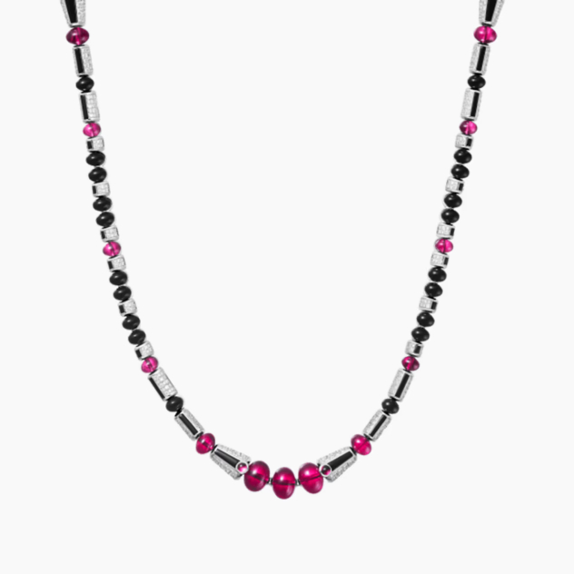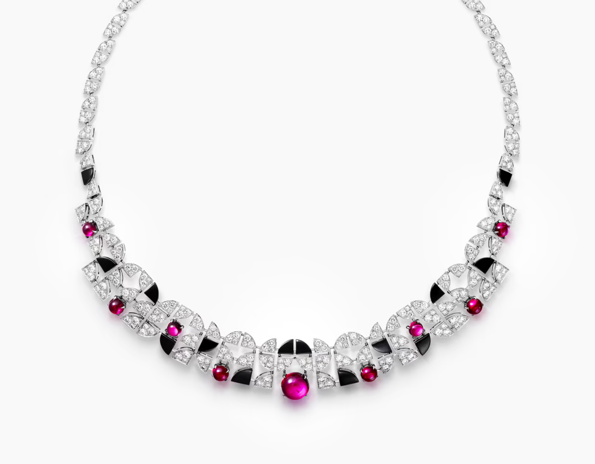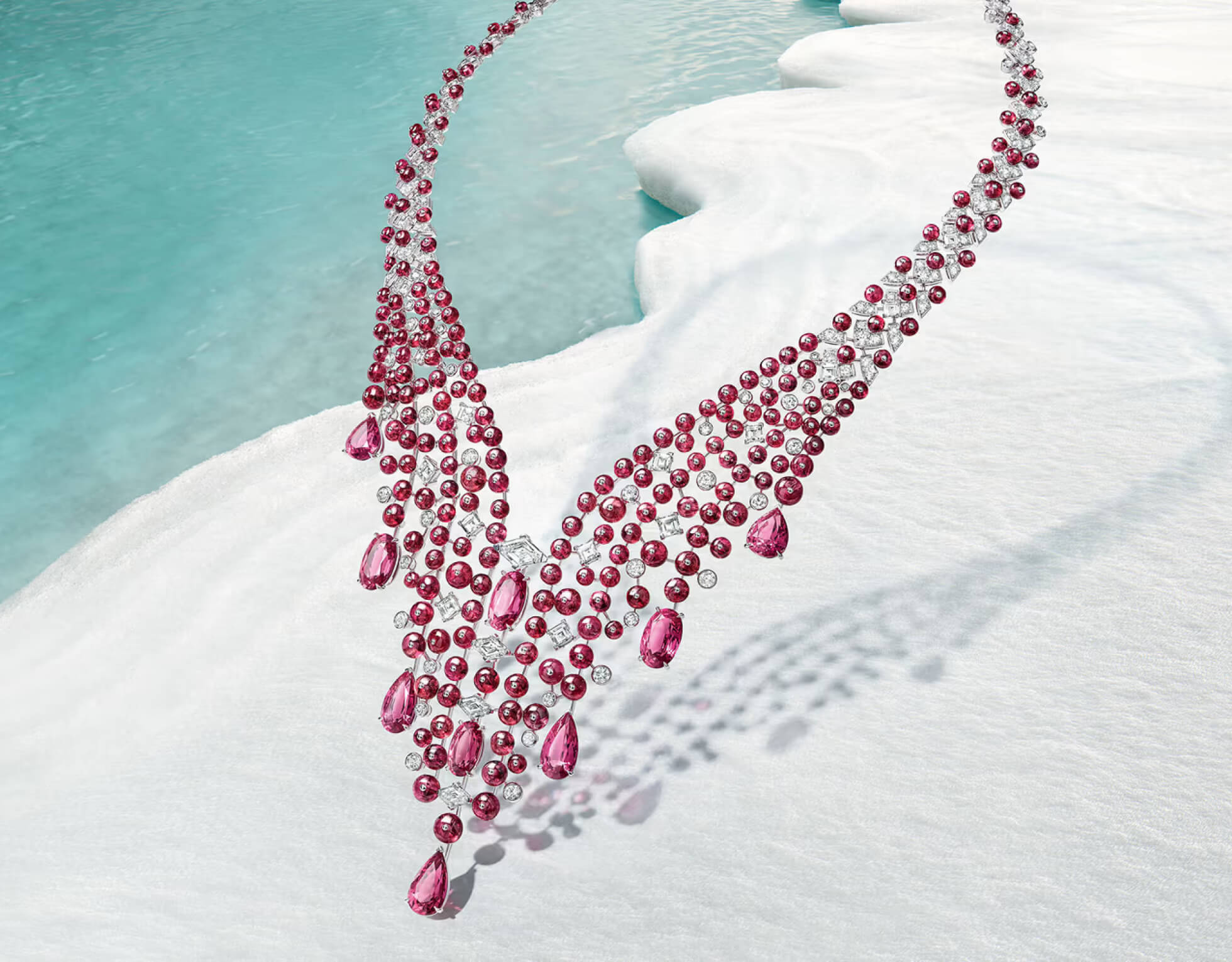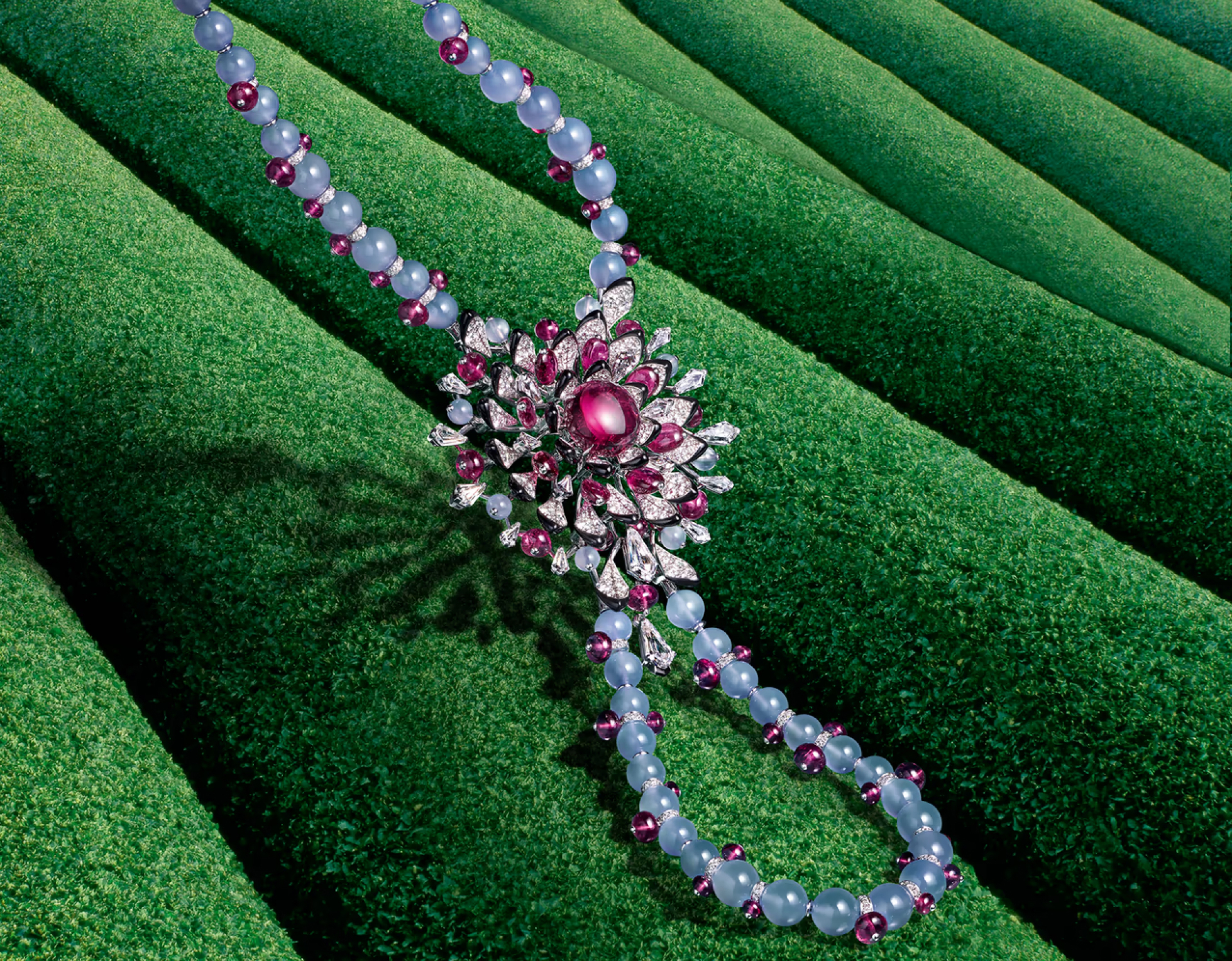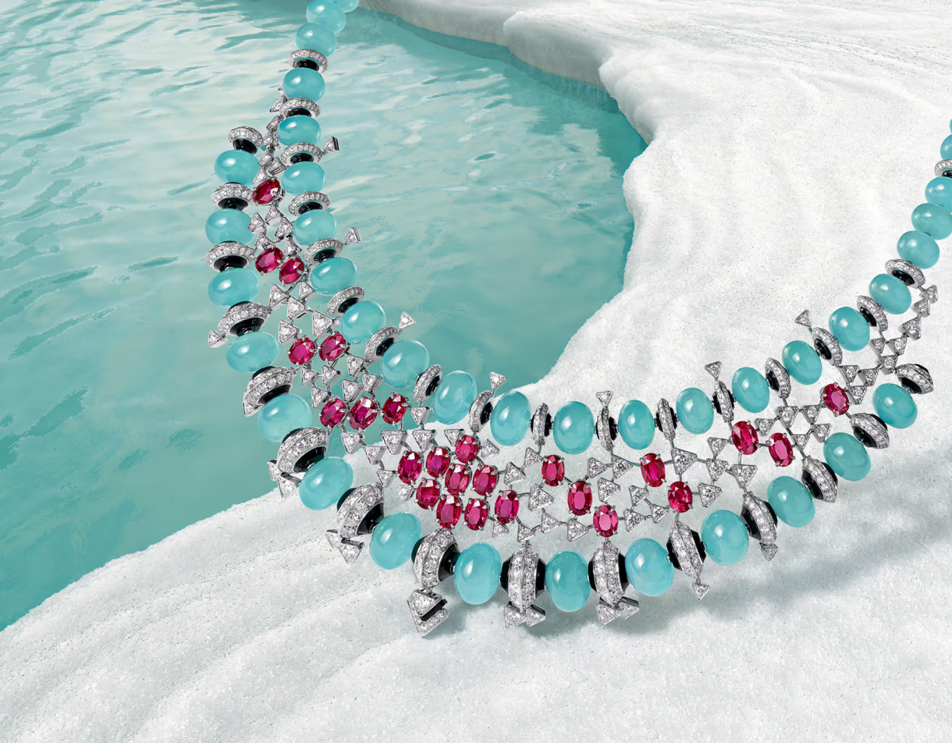 Этим комплектом Cartier отдает дань красоте украшений и, в частности, традиционным мезоамериканским украшениям. Ожерелье, состоящее из двойного ряда лазурных бусин халцедона, раскрывается и демонстрирует переливающееся созвездие рубинов. Тонкие и изящные узоры чередуются между алмазными конусами и ограненными рубинами, которые, кажется, висят без какой-либо связи между собой в невидимой оправе.