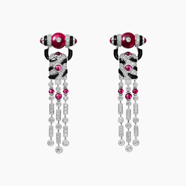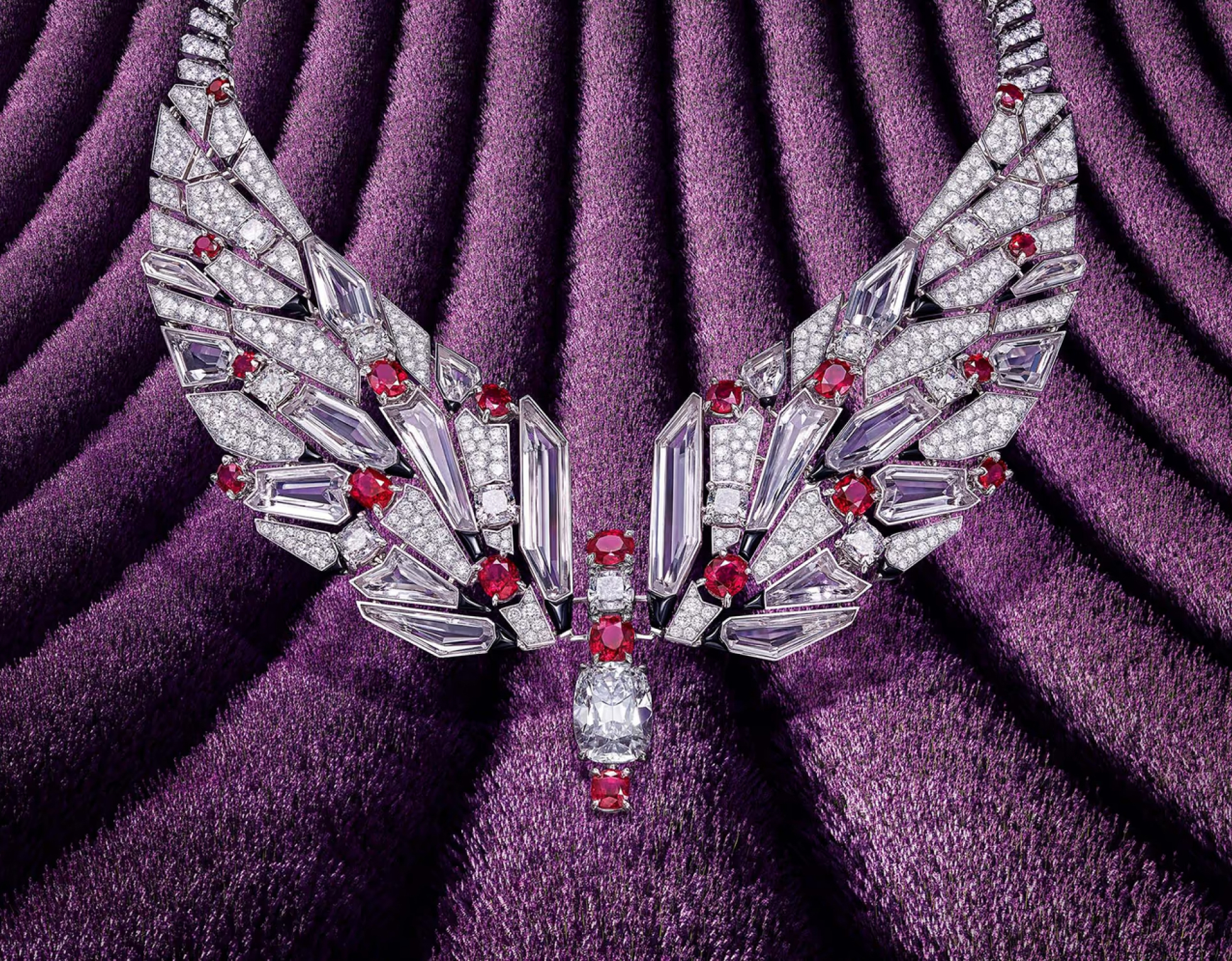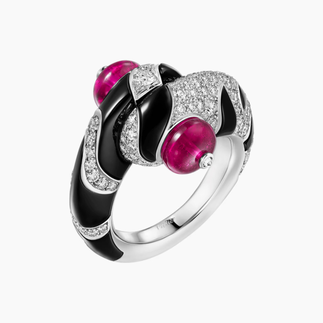 В этом наборе Cartier интерпретирует натуралистический мотив: бабочку. Крыло насекомого, как если бы оно рассматривалось вблизи, фрагментировано и умножено в совершенно абстрактную композицию. Дизайн представляет собой игру на различных возможностях, предлагаемых этим единственным мотивом. В цветовой гамме, которая была дорога Дому уже более века, прикосновения оникса и рубеллита подчеркивают баланс целого и добавляют глубины. Они придают ритм музыкальности дизайна и раскрывают всю его графическую силу.