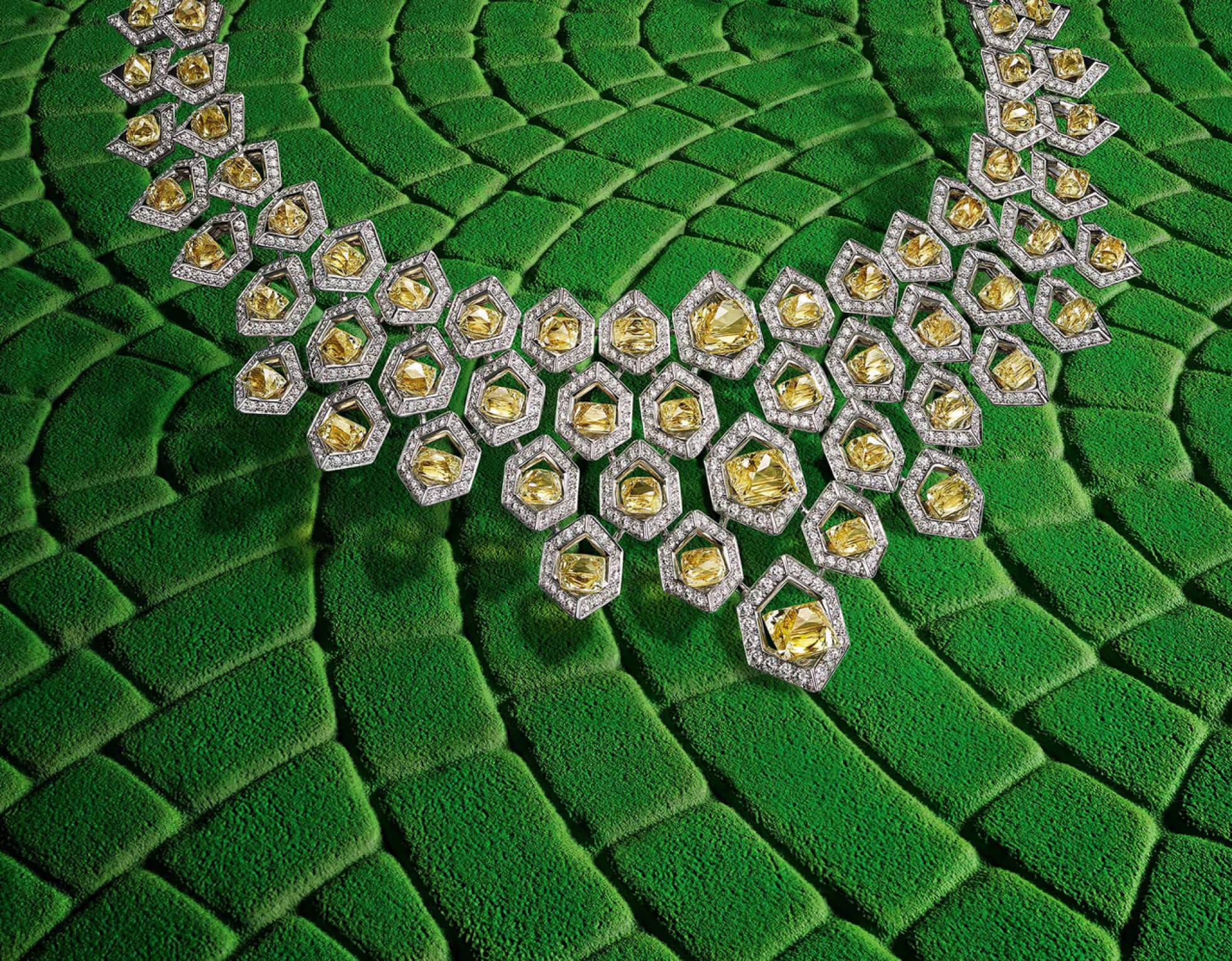 Структура, материал, узор: кожа дракона вдохновляет Cartier. В этом колье 80 желтых бриллиантов общим весом около 79 карат представляют собой чешую этой фантастической рептилии, символизирующей связь между Землей и Небом. Благодаря восьмигранным драгоценным камням, редкая огранка которых редко используется в ювелирном деле, огранка множится и зажигает блеск между камнями. Эти насыщенные солнечные бриллианты помещены в сердце шестиугольных узоров из белого золота, выложенных бриллиантами, которые вместе образуют геометрическую сетку. Они иллюстрируют страсть Cartier к камням необычной формы.