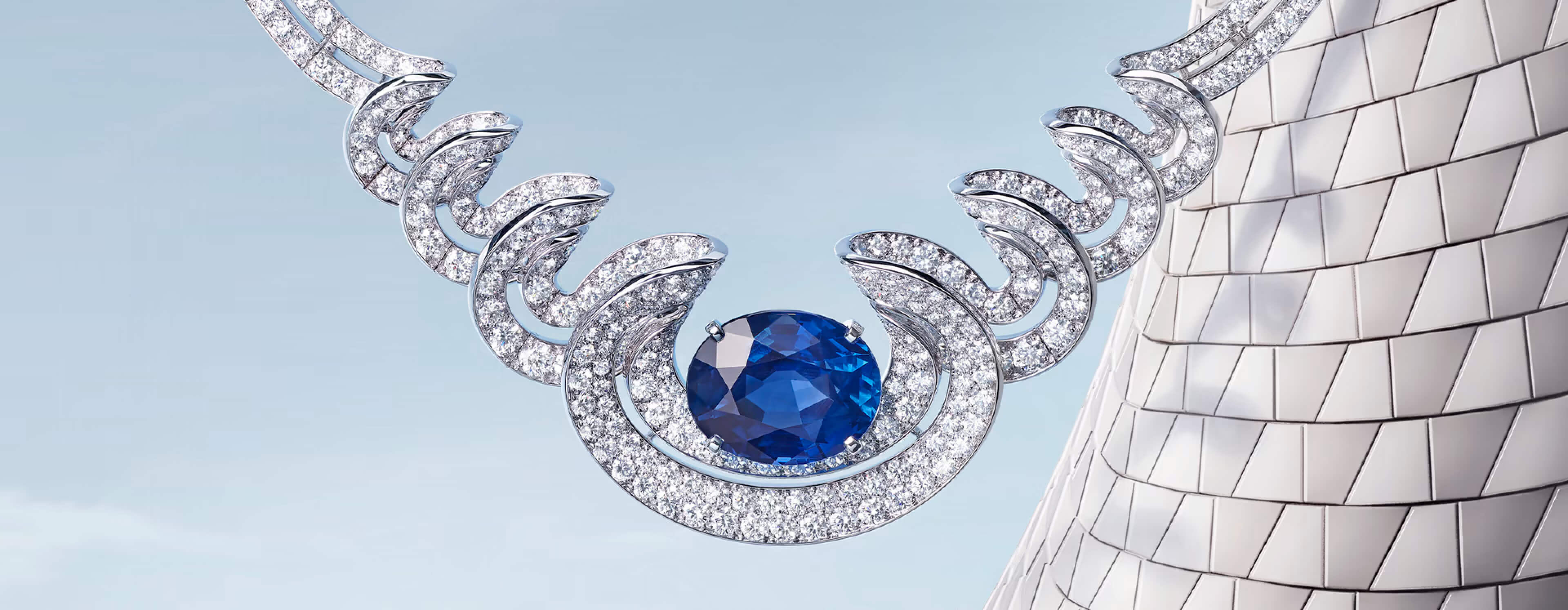 Оживление неодушевленного: именно этого удалось добиться с помощью этого ожерелья, вдохновленного нарядами кружащихся дервишей. Вокруг центрального камня, цейлонского сапфира весом 19,27 карата, изгибы, инкрустированные бриллиантами, вращаются, создавая поразительное ощущение движения.