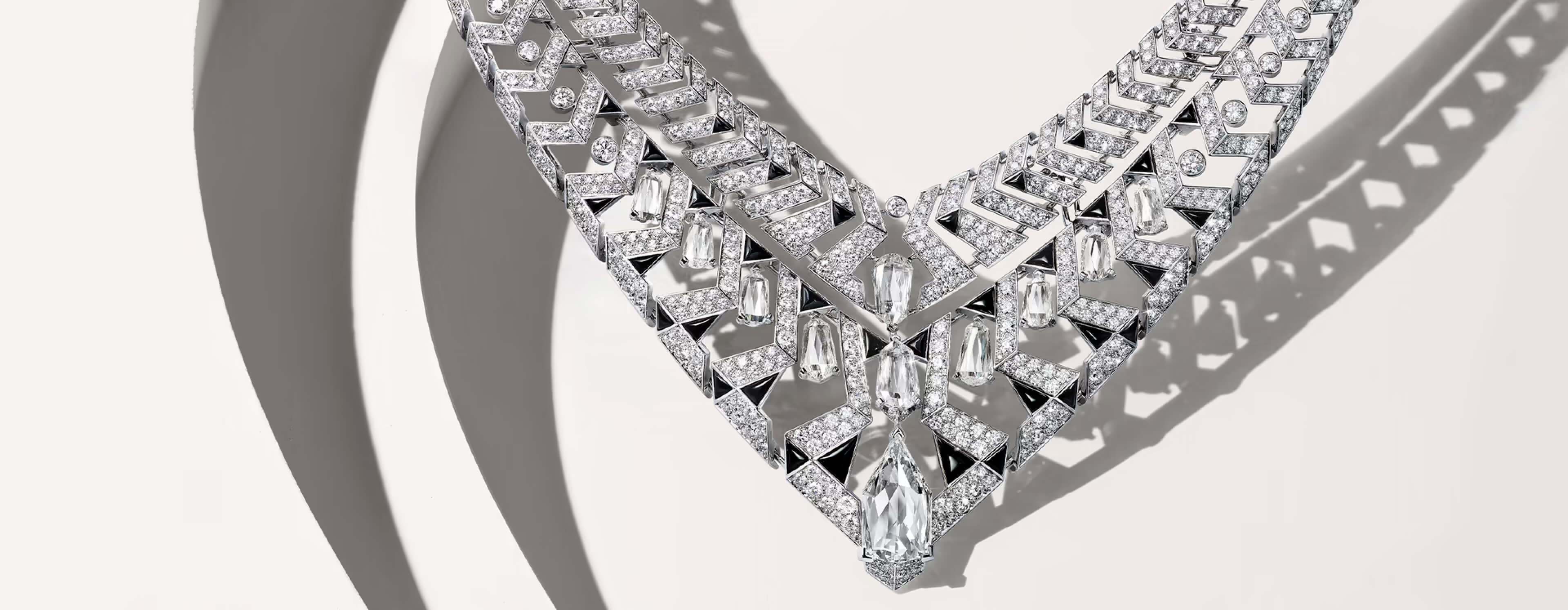 Ожерелье Claustra украшено набором щитовых бриллиантов, в том числе замечательным экземпляром весом 4,02 карата. Благодаря эффектам перспективы и взаимодействию рельефа свет вибрирует и циркулирует. Оникс чередуется с ажурными узорами и бриллиантами, создавая постоянно обновляющийся контраст, который является символом Дома.