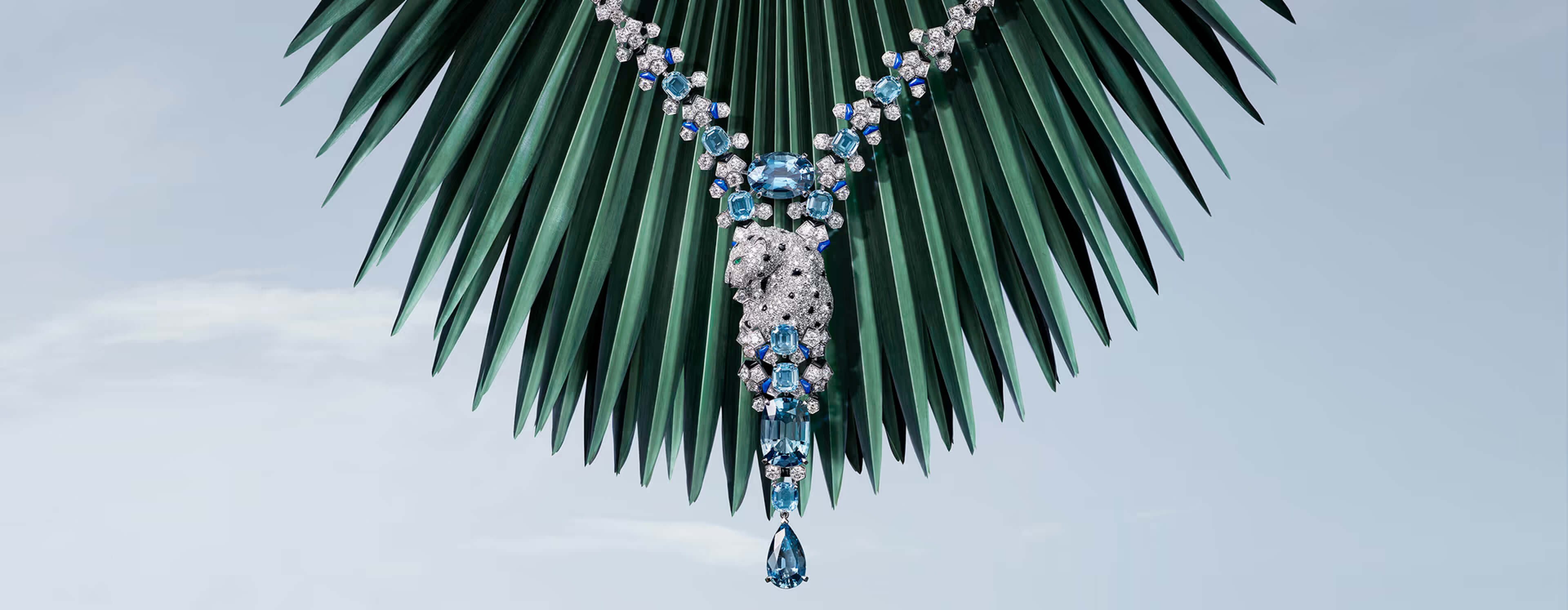 Это колье, новая интерпретация легендарного животного Cartier, сочетает в себе стилизацию и фигуру. Реализм головы создает диалог с абстракцией пиксельной шерсти в пятнах оникса. В его центре расположены три аквамарина общим весом 20,33 карата.