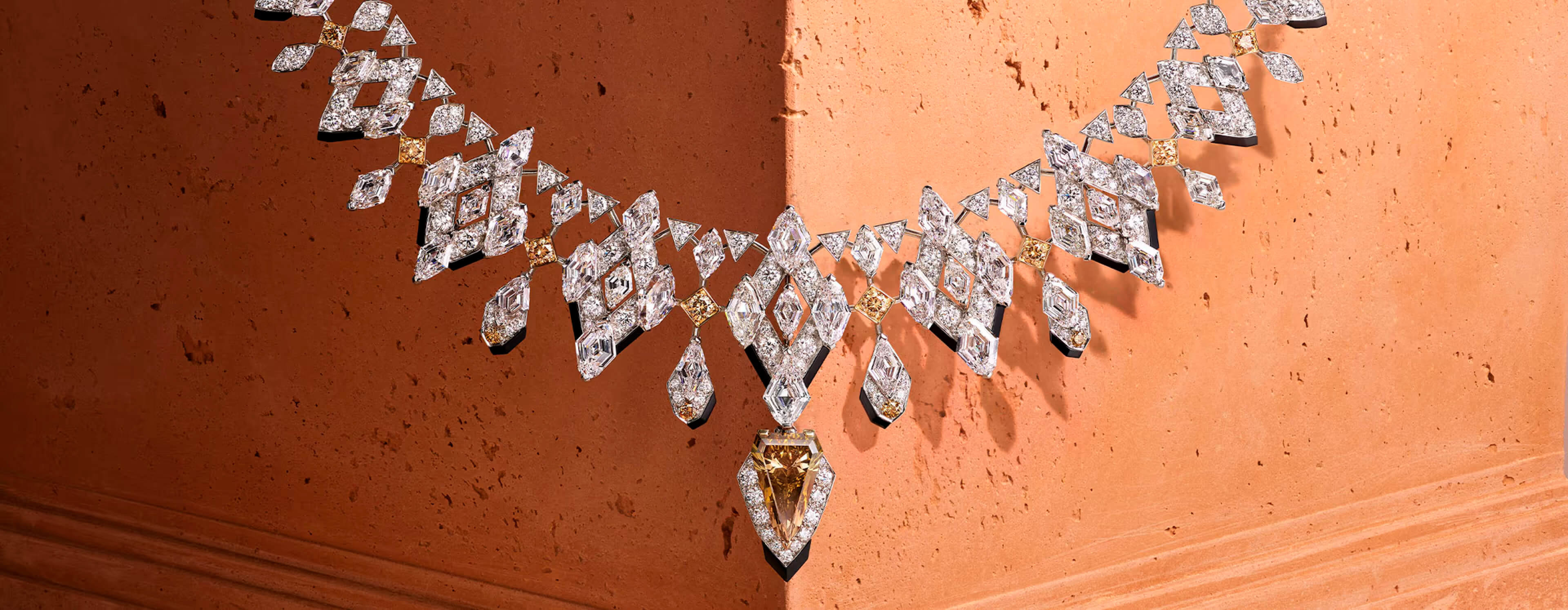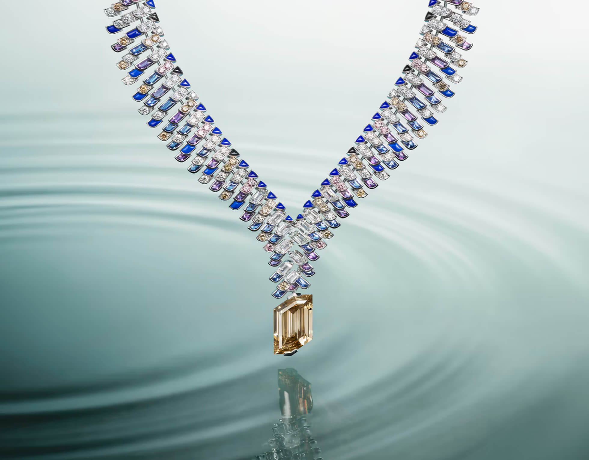 Дань уважения исламскому искусству и машрабии с игрой света и теней. Центральный камень — фантазийный бриллиант щитообразной формы темно-желто-коричневого цвета, который придает ритм дизайну колье.