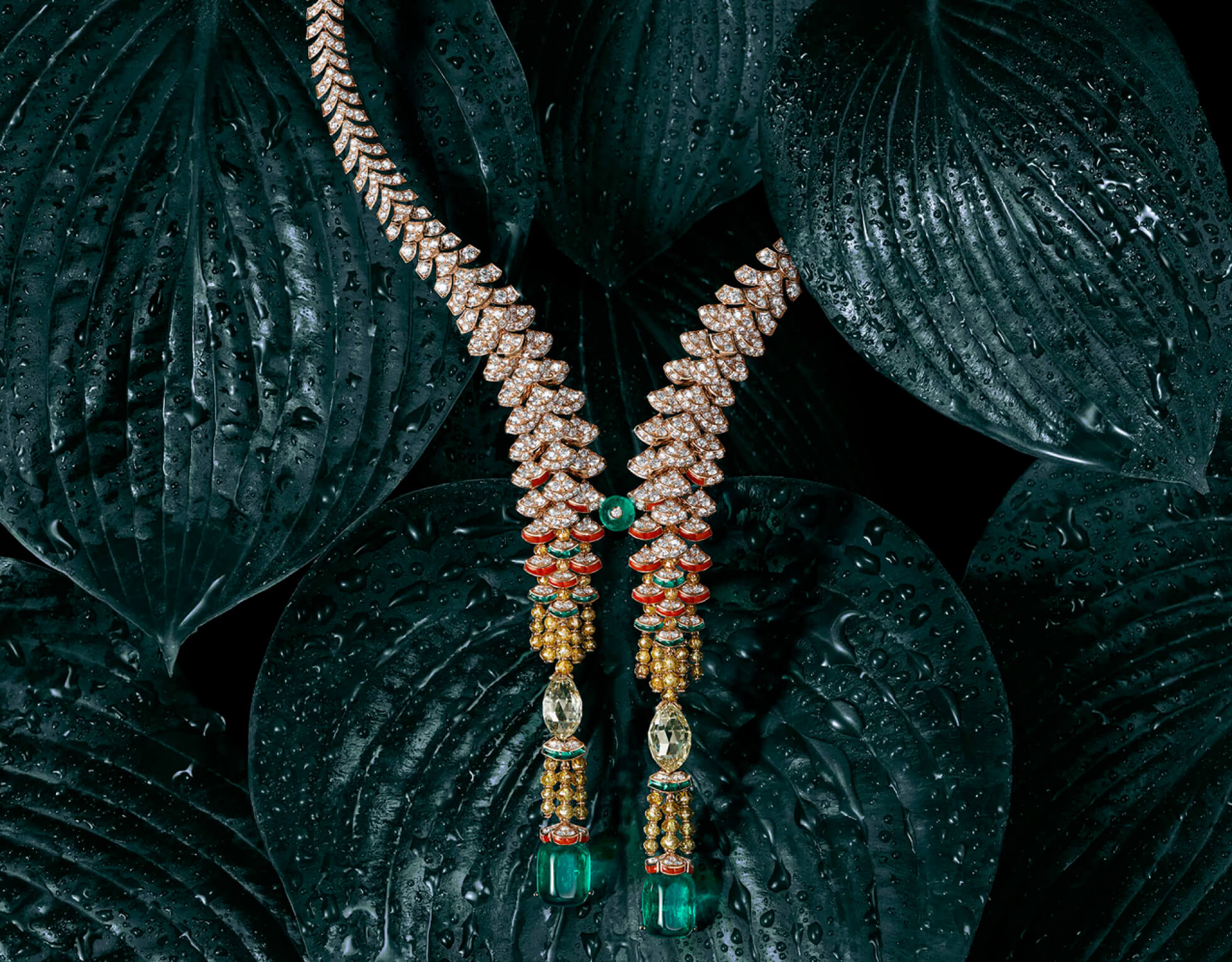 Сосновая шишка или глициния? Это колье с двумя асимметричными подвесками из чешуек розового золота с бриллиантовым паве дополнено двумя шестиугольными колумбийскими изумрудами общим весом 25,84 карата. Эти исключительные драгоценные камни можно снять с колье и носить как серьги. Это искусство модульных конструкций – одна из визитных карточек Дома.