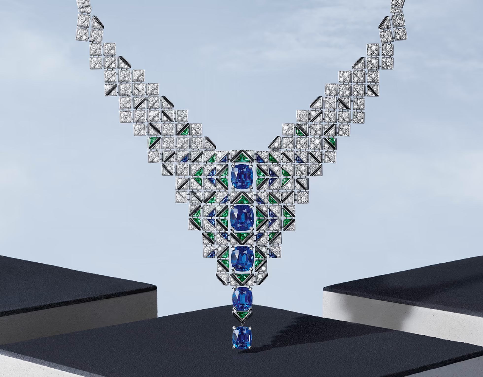 Отправная точка? Расположение цейлонских сапфиров, ось сетки, состоящей из сапфировых и изумрудных узоров, создает почти кинетический эффект. Ансамбль создает хроматическую гармонию из синего и зеленого цветов, так называемого «павлиньего декора», разработанного Луи Картье.