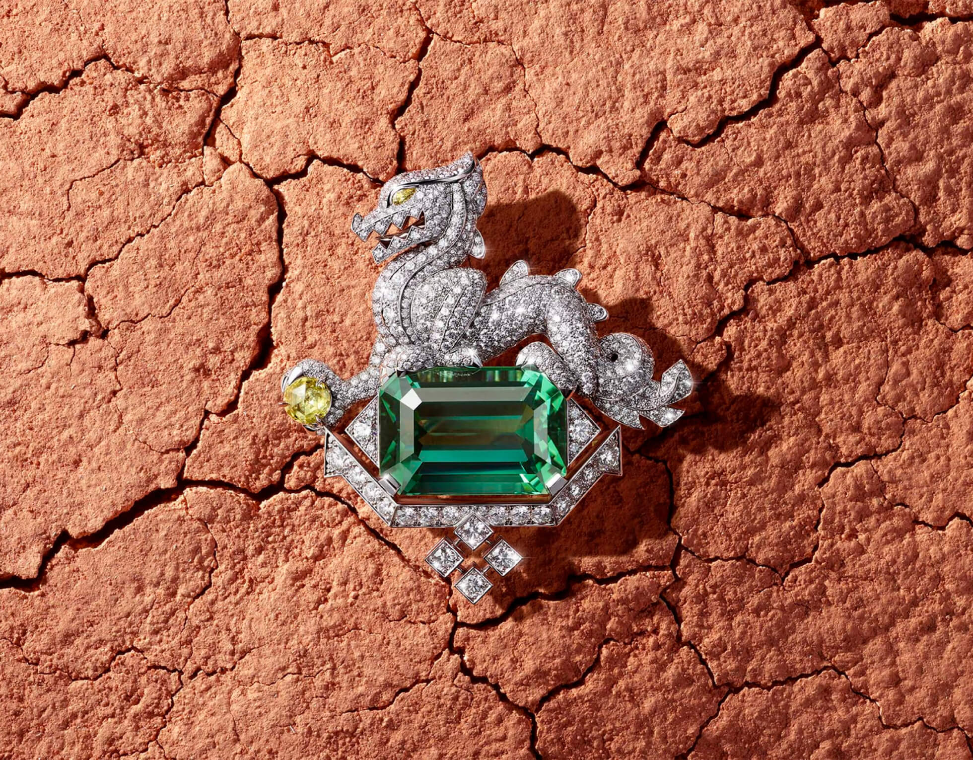 От гребня и чешуи до заостренных конечностей дракон, верное творение бестиария Cartier, наполнен яркой энергией, которая усиливается реалистичностью дизайна. В этом украшении доминирует восьмиугольный турмалин весом 30,11 карата, а в одной из лап «дракон» держит желтый бриллиант.