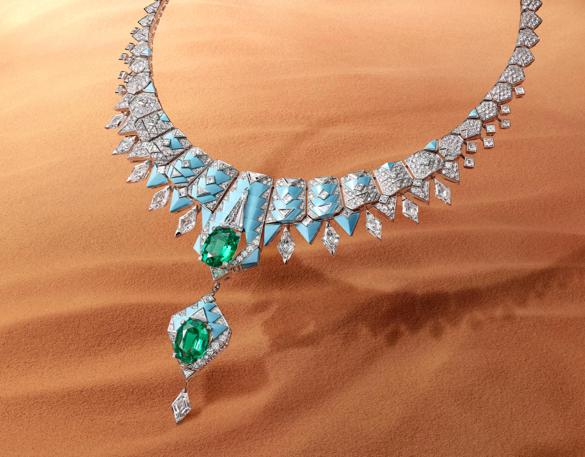 Это колье представляет собой изысканную и графическую интерпретацию одной из основополагающих тем стиля Cartier: исламского искусства и великолепия его архитектуры. Интенсивность, основанная на силе гармонии изумрудов из Замбии и бирюзы индивидуальной огранки. Центральный кулон превращается в брошь.