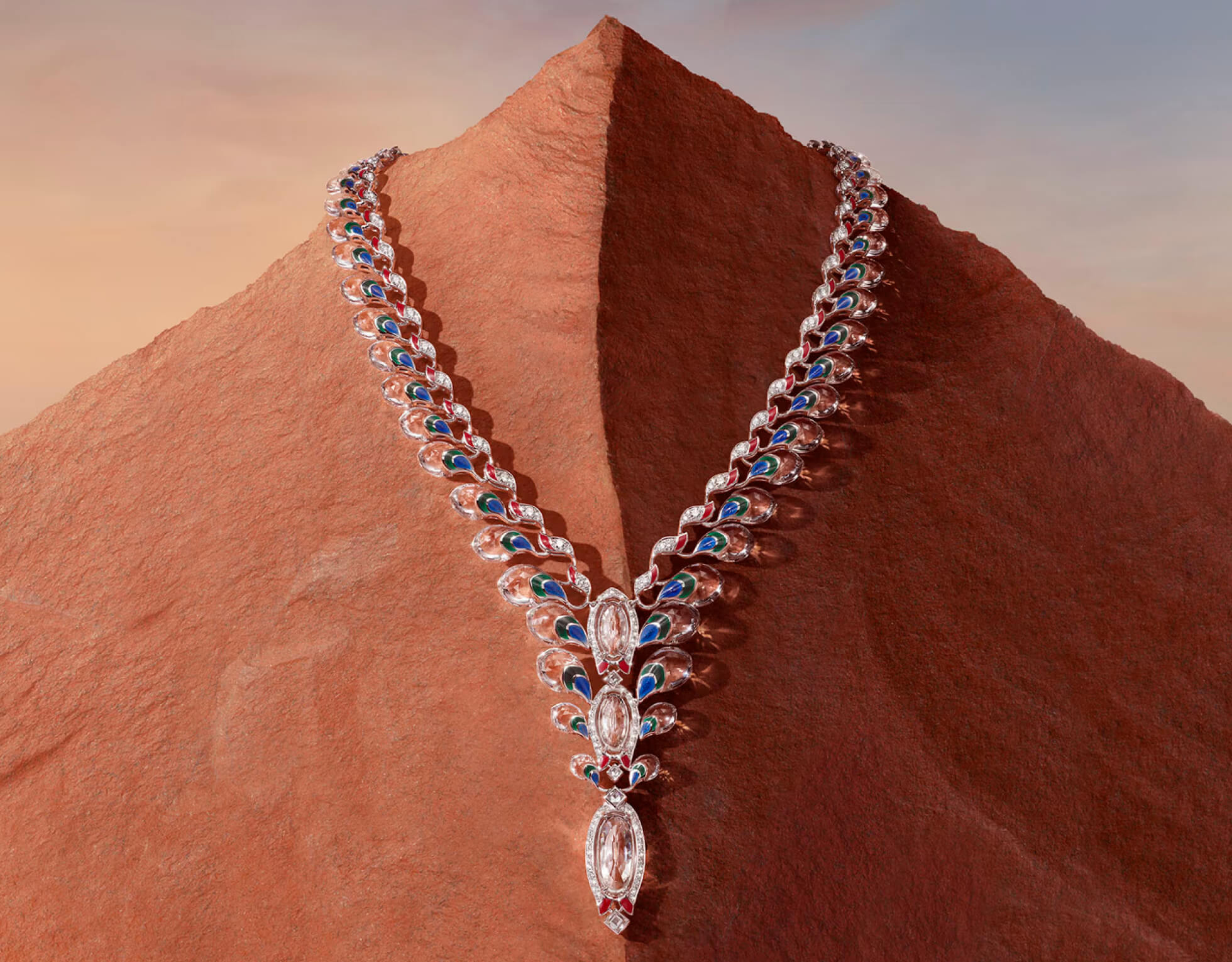 В двустороннем колье сплелись различные цвета и узоры. С одной стороны – яркое сияние бриллиантов и резного горного хрусталя. С другой стороны, красный, зеленый и синий лак – легендарное цветовое сочетание Cartier. В центре – три овальных бриллианта, видимых спереди и сзади.