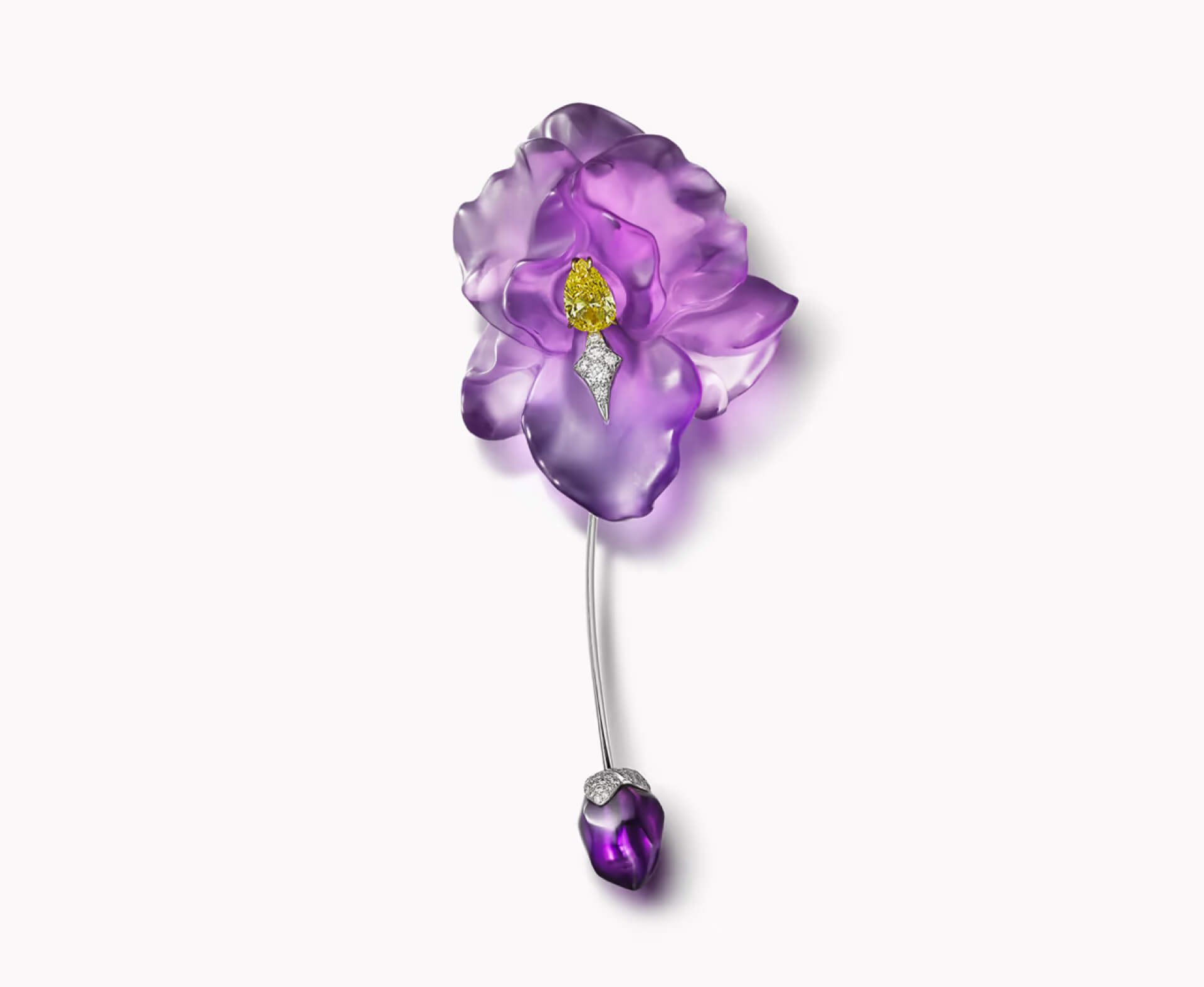 Цветы, особенно цветы с характером – традиционный мотив творчества Cartier. Среди них орхидея, объединяющая в себе чарующую странность, хрупкость и силу, нежность и опасность. Специалист по глиптике Cartier создал распустившийся цветок из необработанного аметиста. Глиптика представляет собой искусство гравировки и скульптурной обработки твердых камней и благородных материалов. Cartier – один из немногих ювелирных Домов, которые владеют этим практически исчезнувшим ремеслом и передают его секреты молодому поколению. Брошь в виде цветка из белого и желтого золота с бриллиантовым паважем привлекает внимание пестиком из ярко-желтого грушевидного бриллианта весом 0,81 карата.