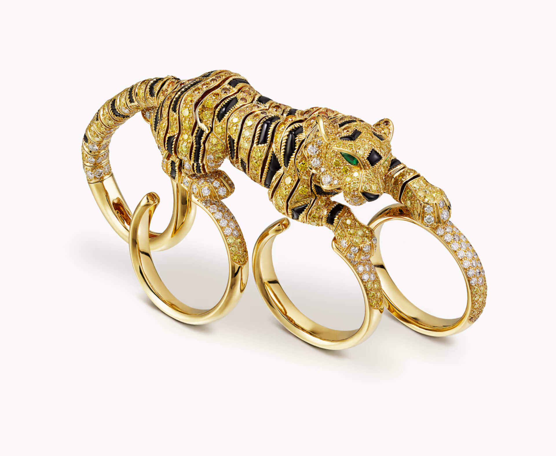 Гибкий силуэт из желтого золота, стройные лапы и полосатый окрас из динамичного оникса: тигр с белыми, желтыми и оранжевыми бриллиантами поражает своей жизненной силой. Кольцо с реалистичным дизайном оживает на руке благодаря полностью подвижной структуре.