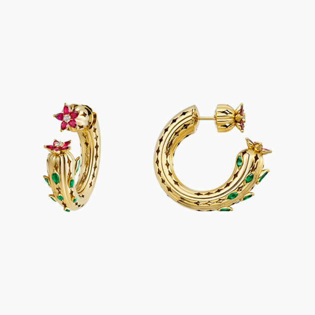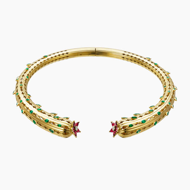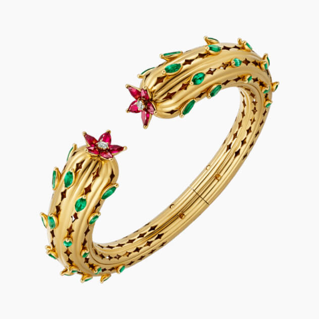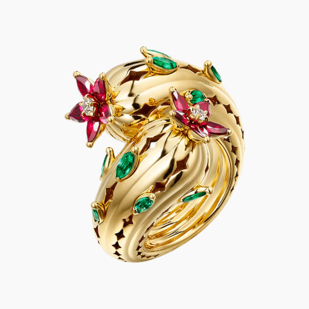 Кольцо с изумрудами и рубинами отражает неукротимый и исключительный характер, свойственный изделиям Cartier. Резное желтое золото с ажурными отверстиями в форме шипов: кольцо Cactus de Cartier отдает должное мастерству ювелиров. Эффектная и при этом легкая и нежная модель воспевает красоту и двойственность своего источника вдохновения.