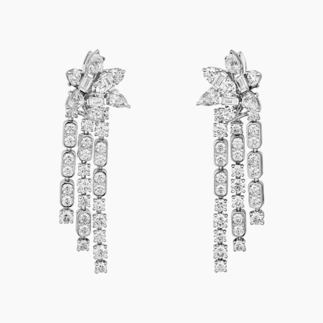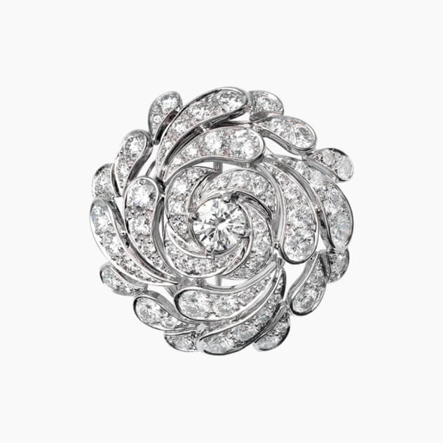 Настоящая трехмерная скульптура, изделие с круглыми бриллиантами старинной огранки, багетной огранки и огранки 8/8 представляет собой образец виртуозности мастеров Дома. Брошь является одной из самых красноречивых иллюстраций того периода: в конце 1930-х годов Дом Cartier объединил сверкающий белый дизайн с возвращением к утонченному натурализму, который слегка отличался от реализма.