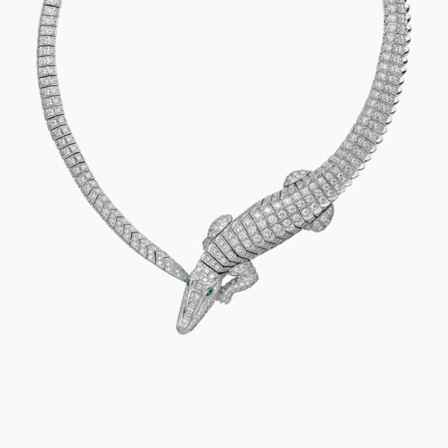 Творческая смелость Cartier отражается в выборе необычных животных. Крокодил – один из них. Модель Высокого ювелирного искусства с абстрактным дизайном передает шероховатость его чешуек и сияние зеленых глаз. Бриллианты различных огранок создают композицию изделия. Изумруды, расположенные ближе к шее, притягивают взгляд к подвеске: она отличается асимметричной композицией из бриллиантов (общим весом 6,90 карата) и замбийских изумрудов (пять из которых имеют общий вес 11,31 карата).