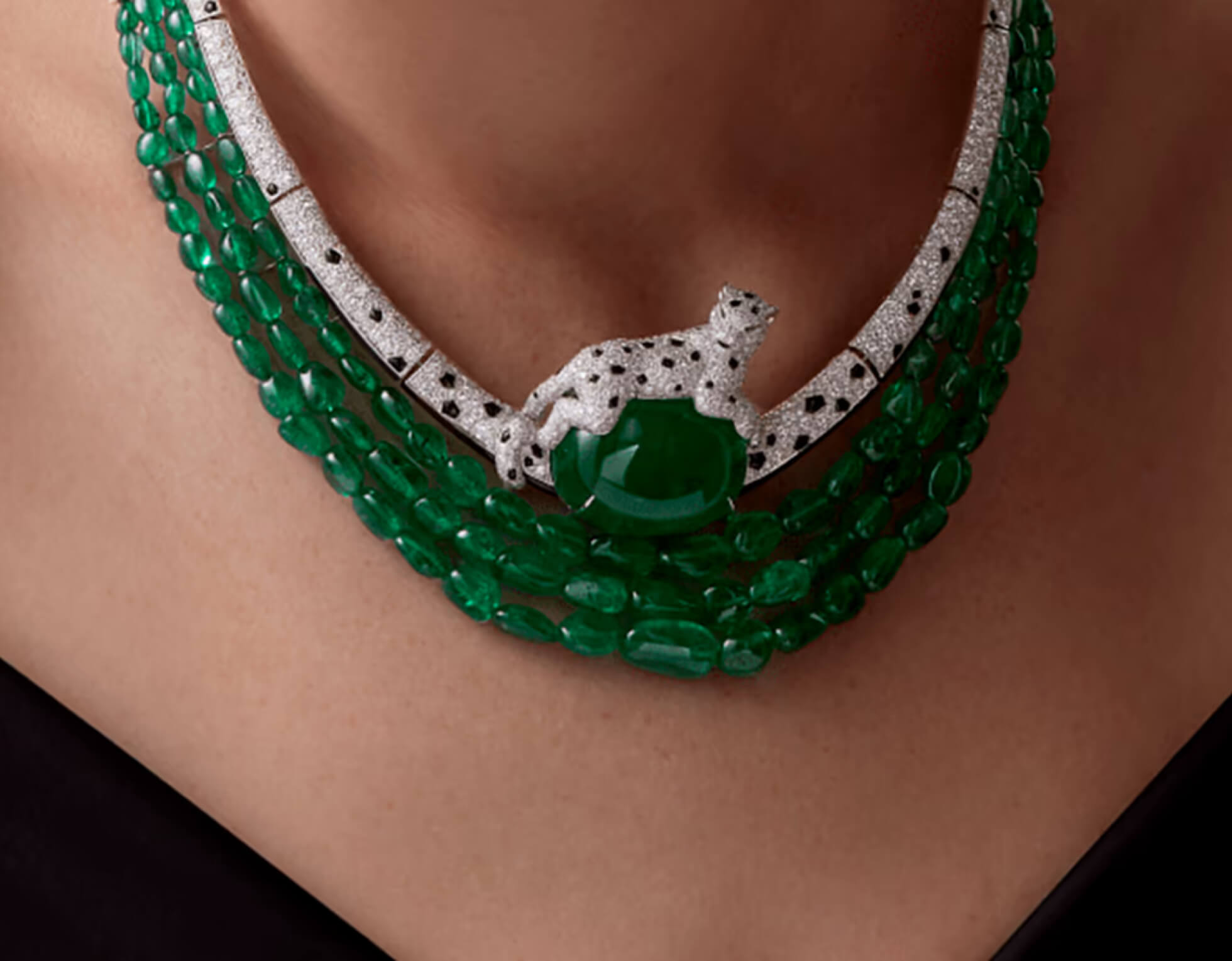 Это колье привлекает внимание объемной фигурой пантеры, восседающей на замбийском изумруде в форме кабошона весом 73,07 карата. Культовый символ Дома наблюдает за сплетением виноградных лоз, созданных путем нанизывания 163 бусин из изумруда разного размера общим весом около 178 карат. Роскошные материалы и неправильные формы контрастируют с реалистичным изображением хищницы с глазами из изумрудов и линией вокруг шеи с мотивом из бриллиантов и оникса, которая воссоздает шерсть пантеры.