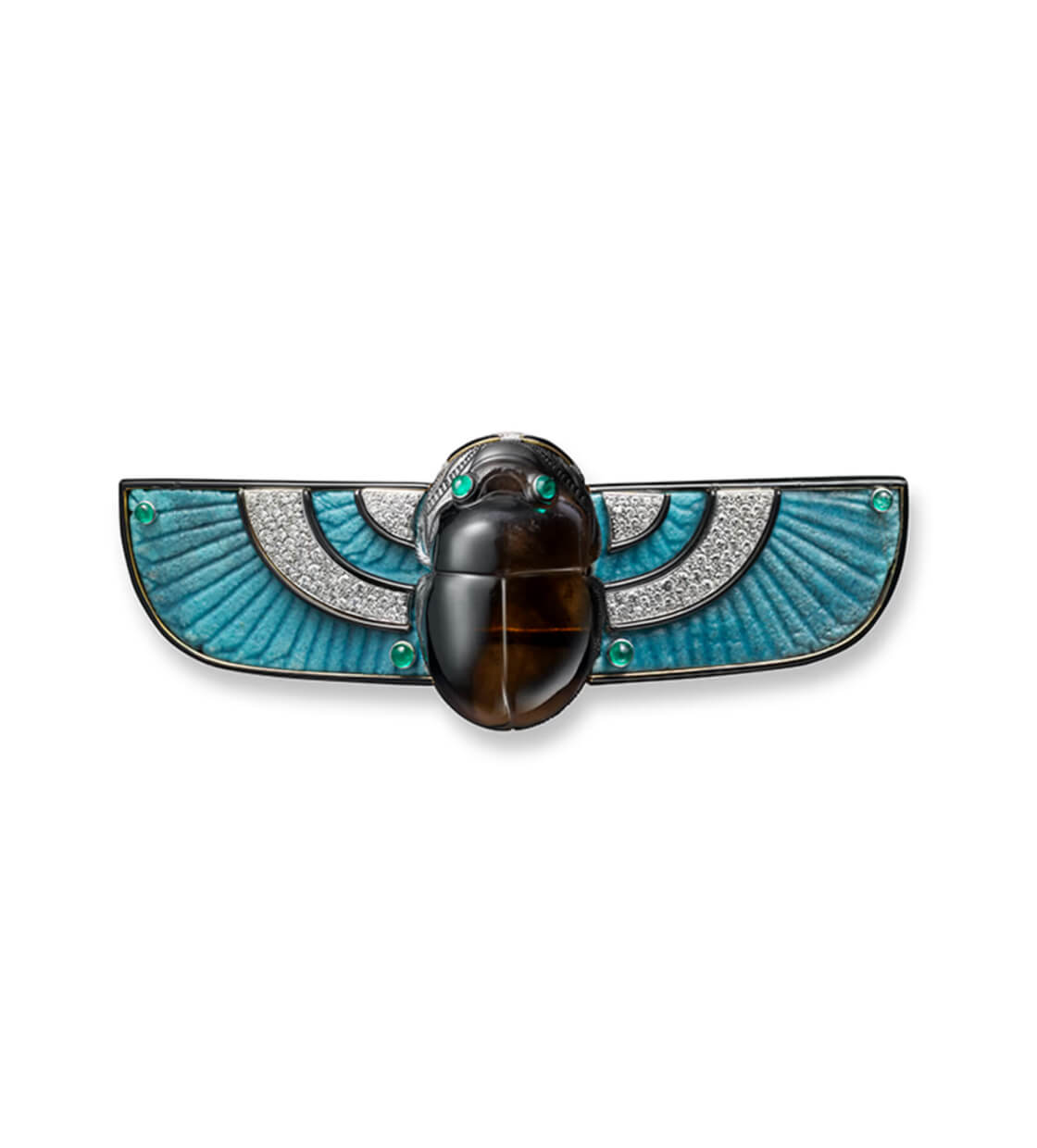 Крылья скарабея декорированы деталями из керамики второй половины первого тысячелетия до н. э. из запасников Cartier, где хранятся фрагменты украшений и старинных предметов персидского, индийского, китайского и египетского искусства.