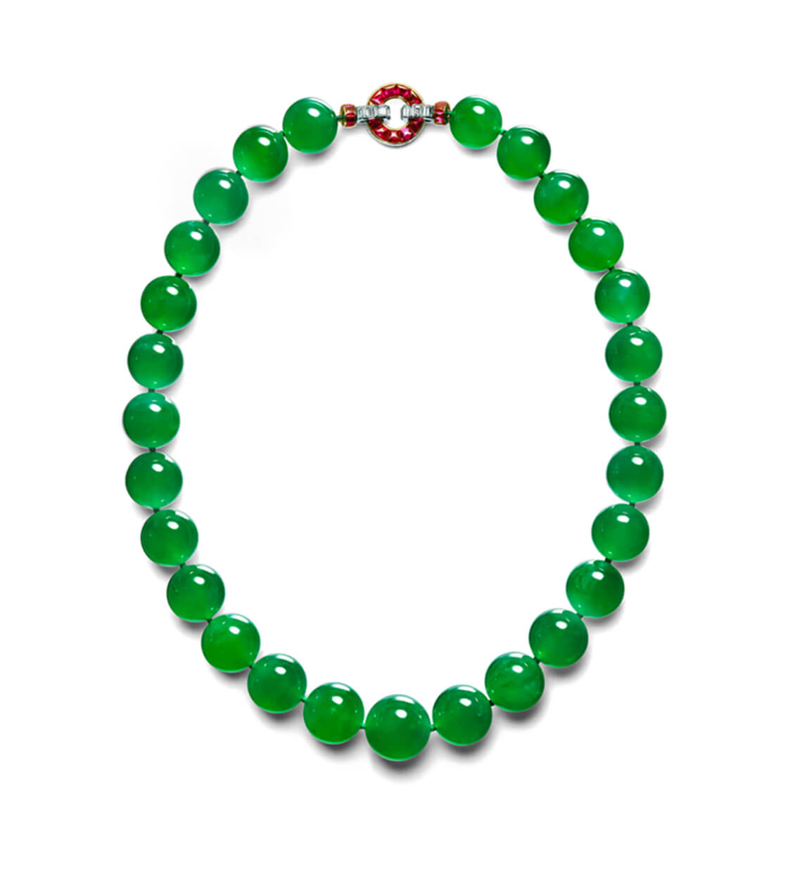 27 бусин из жадеита, платина, золото, бриллианты, рубины