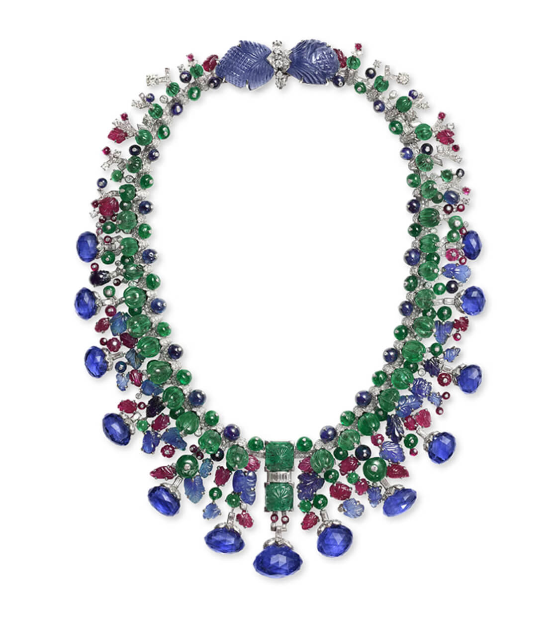 Платина, белое золото, белые и желтые бриллианты, кашмирский сапфир весом 152,35 карата, сапфиры