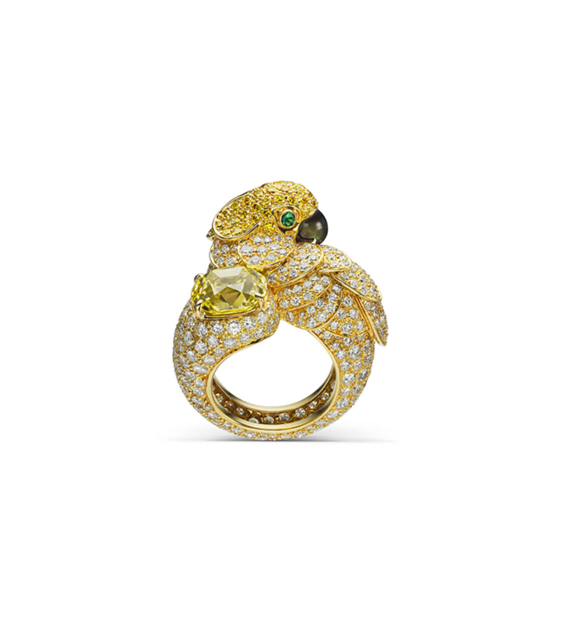 Золото, белые и ярко-желтые фантазийные бриллианты, изумруды, перламутр