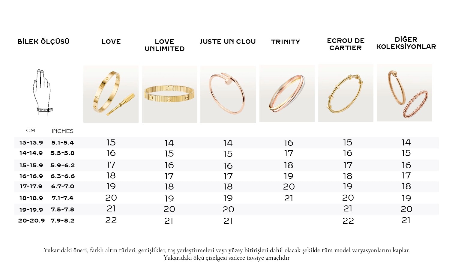 Cartier tasarımlarımızın ölçüleri koleksiyona bağlı olarak değişiklik gösterir. Tüm bilezik ölçülerini öneri tablomuzda bulabilirsiniz: