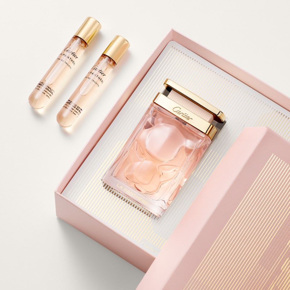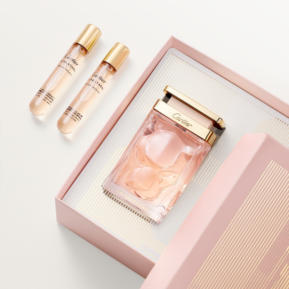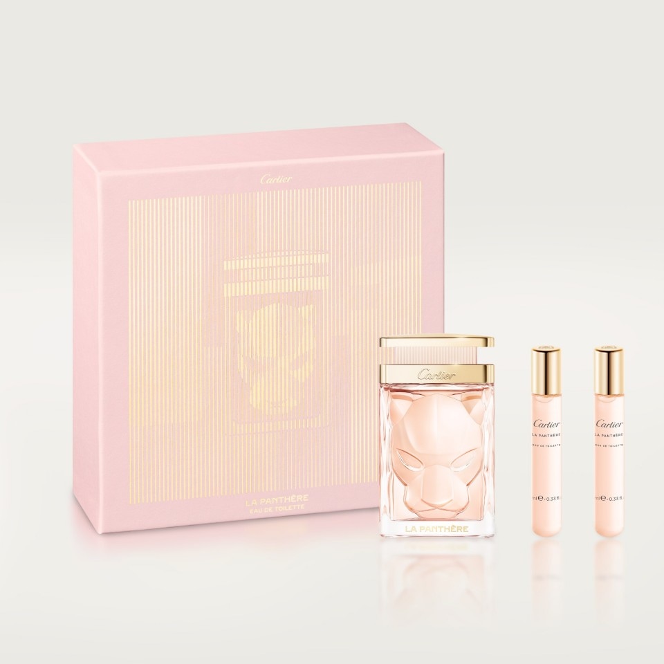 此禮品裝包括 Panthère 系列100毫升淡香水及2瓶10毫升迷你噴霧。