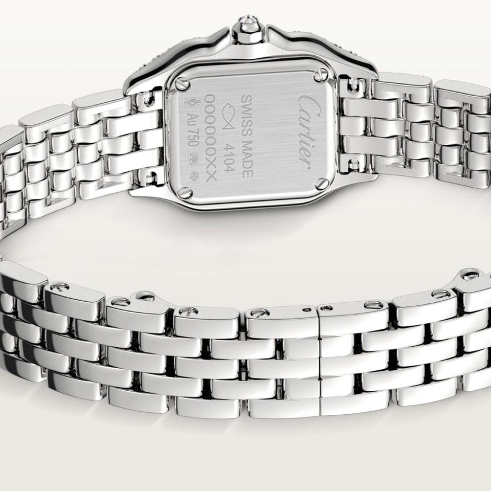 Panthère de Cartier美洲豹腕錶,迷你款,石英機芯。鍍銠750/1000白K金錶殼和八邊形錶冠鑲嵌99顆共重0.42克拉的圓形明亮式切割鑽石。鍍銀錶盤,藍鋼劍形指針,藍寶石水晶鏡面。鍍銠750/1000白K金錶鍊。尺寸:25毫米x20毫米,厚度:6毫米。防水深度3巴(約30米)。