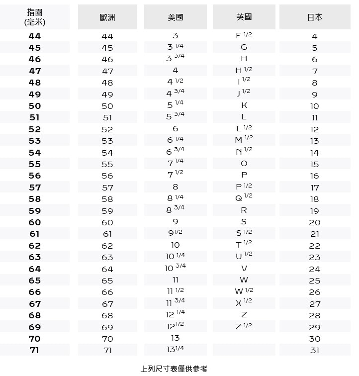 如您仍不確定尺寸,根據我們的免費退換政策,您可更換其他尺寸的戒指。請注意,經鐫刻的戒指或有使用痕跡的戒指將無法退換。