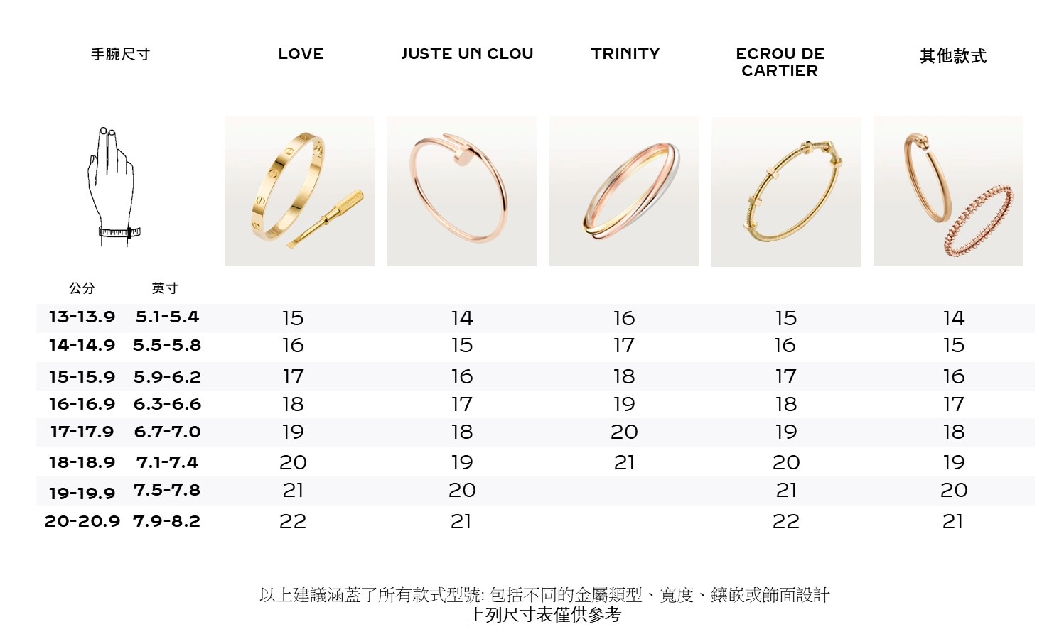 卡地亞作品的尺寸因系列而異。請參考我們的尺寸表,了解所有手環尺寸: