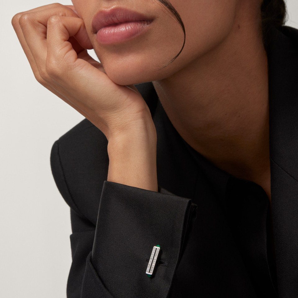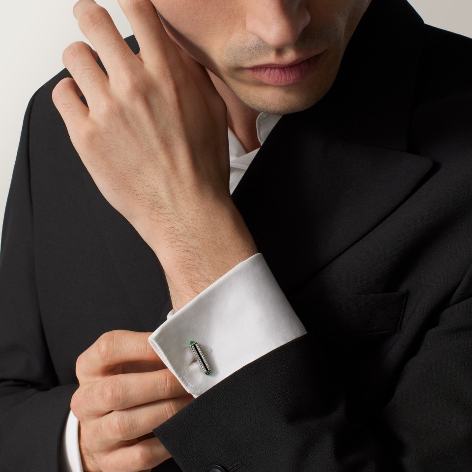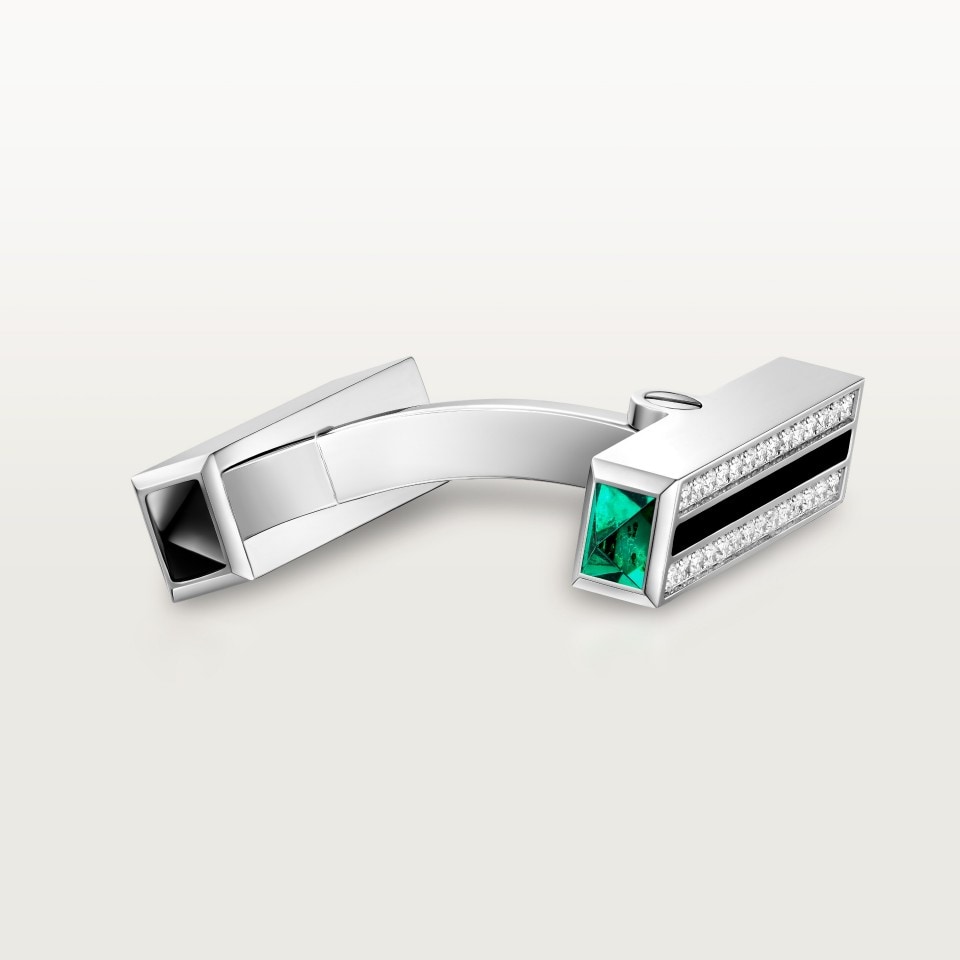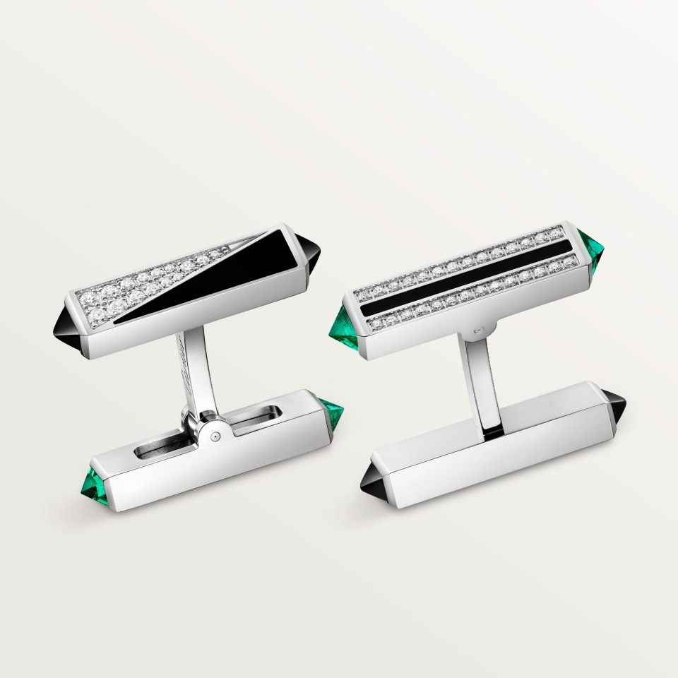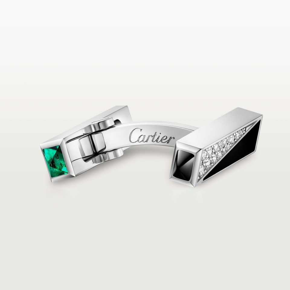 Géometrie & Contrastes袖扣,750/1000镀铑白金,祖母绿,缟玛瑙和圆形明亮式切割钻石。