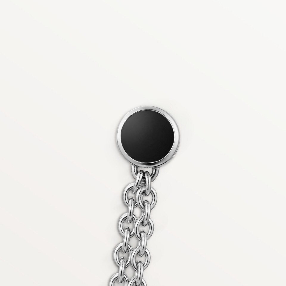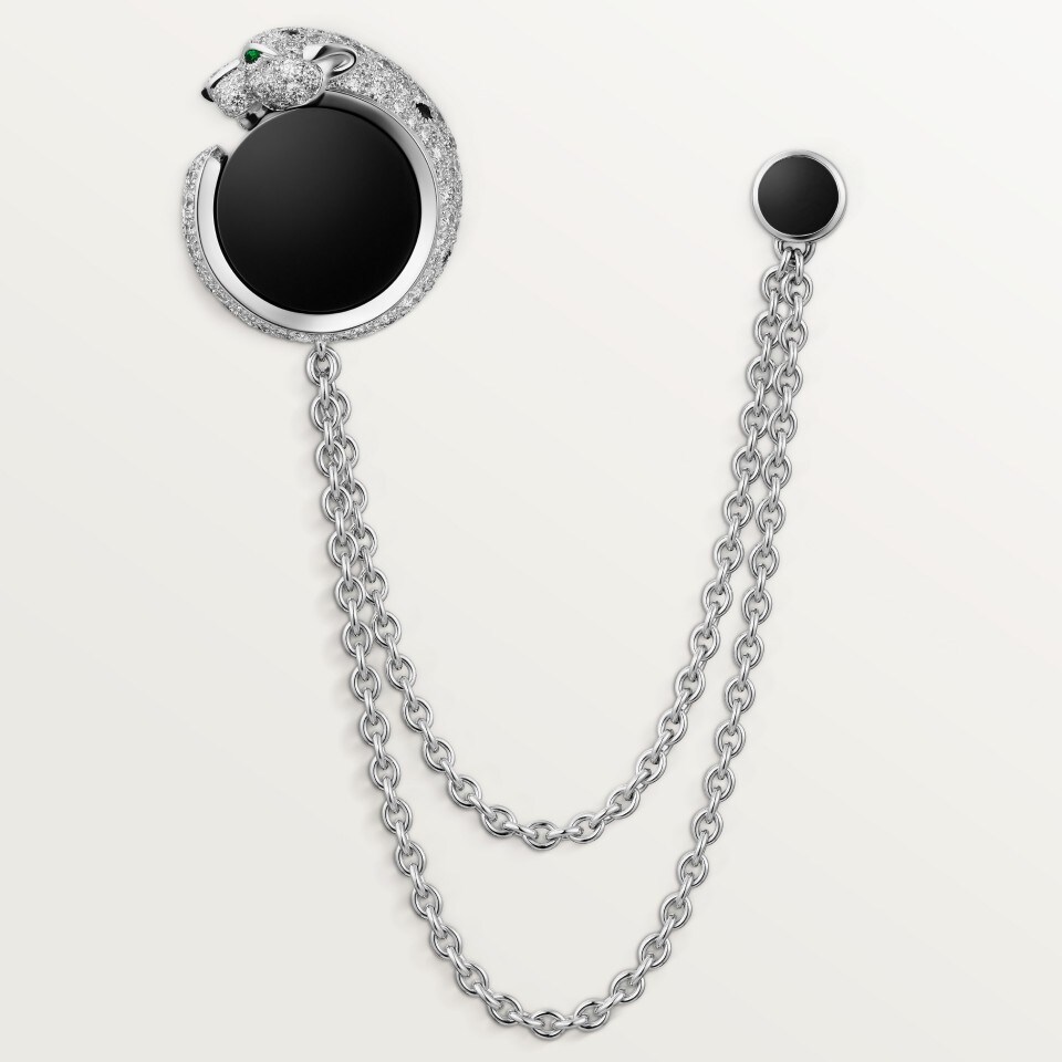Panthère de Cartier卡地亚猎豹系列口袋珠宝,750‰镀铑白金,铺镶148颗钻石,总重1.01克拉,祖母绿豹眼,黑色缟玛瑙豹斑,缟玛瑙位于中央。尺寸:19.8 x 17.7毫米,链长:99.5毫米