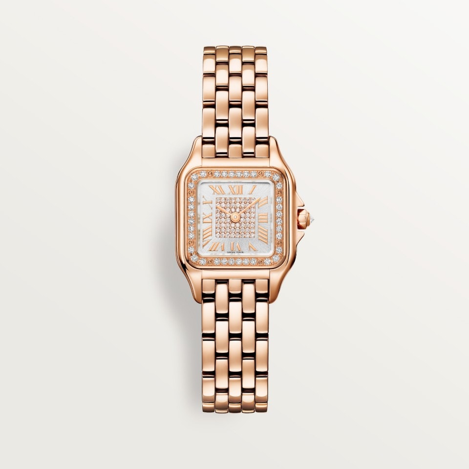 Panthère de Cartier卡地亚猎豹腕表,小号表款,石英机芯。750/1000玫瑰金表壳,镶嵌36颗明亮式切割圆钻,总重0.23克拉。尺寸:30.3毫米 x 22毫米,厚度:6.3毫米。750/1000玫瑰金八角形表冠,镶嵌一颗0.02克拉明亮式切割圆钻。镀银阳光射线纹饰表盘,镶嵌60颗明亮式切割圆钻,总重0.12克拉,剑形镀玫瑰金指针。 750/1000玫瑰金表链。生活防水深度3巴(约30米)。