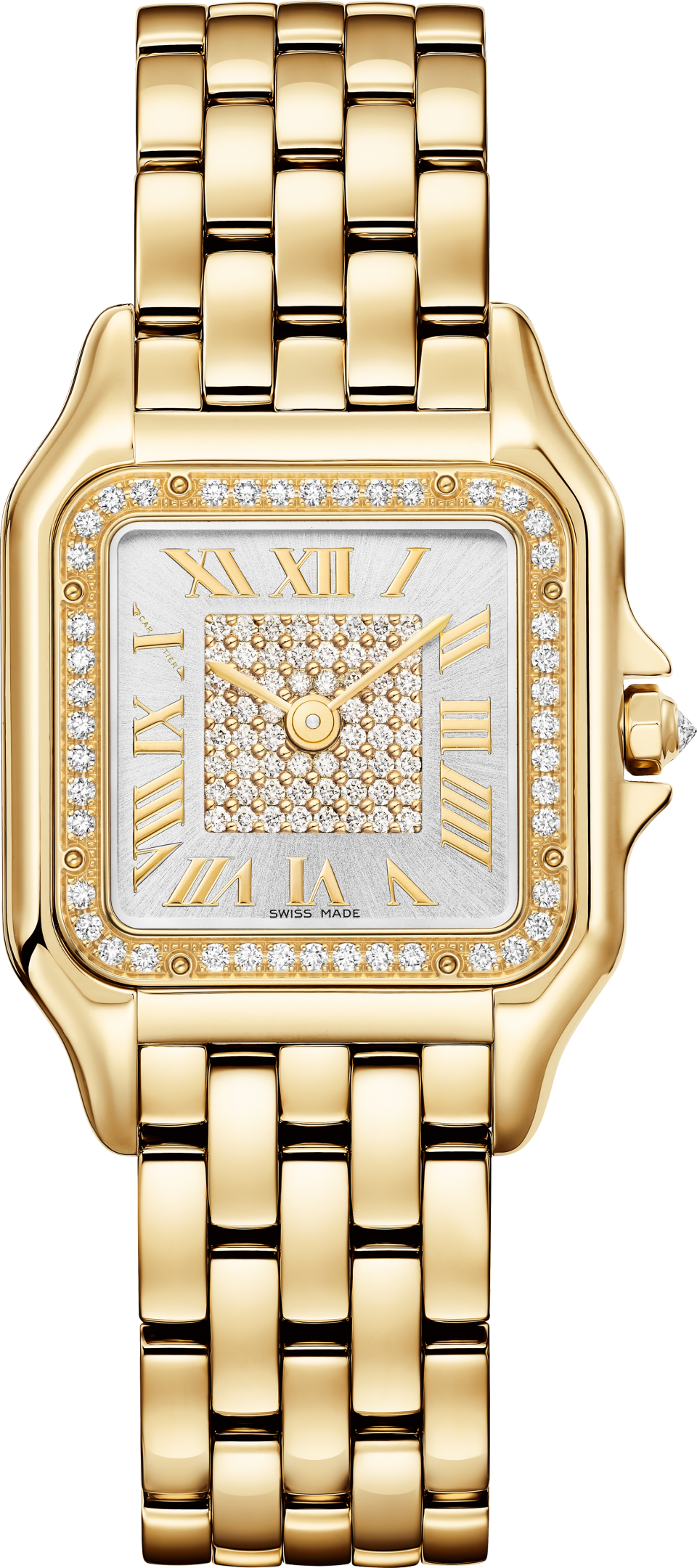 Panthère de Cartier卡地亚猎豹腕表,中号表款,石英机芯。750/1000黄金表壳,镶嵌44颗明亮式切割圆钻,总重0.28克拉。尺寸:36.5毫米 x 26.7毫米,厚度:6.8毫米。750/1000黄金八角形表冠,镶嵌一颗0.02克拉明亮式切割圆钻。镀银阳光射线纹饰表盘,镶嵌60颗明亮式切割圆钻,总重0.22克拉,金色剑形指针。 750/1000黄金表链。生活防水深度3巴(约30米)。