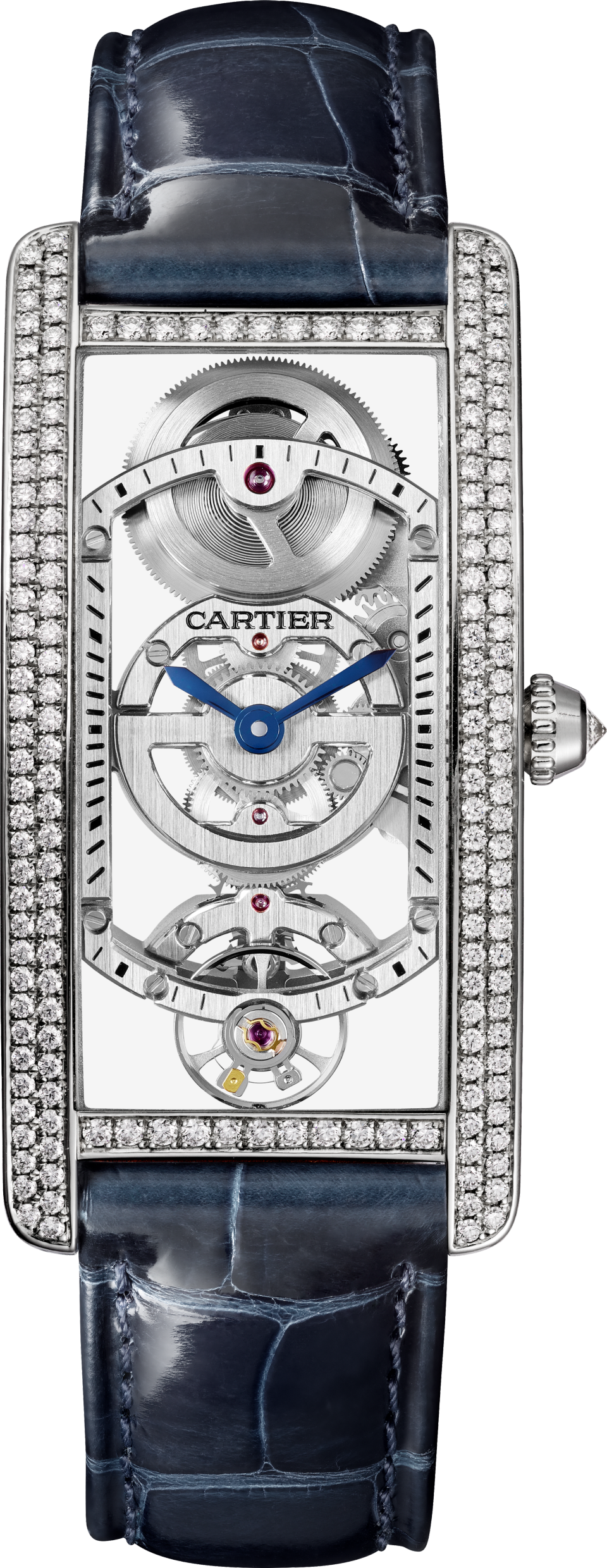 Tank Cintrée镂空腕表,卡地亚工作坊精制9917 MC型手动上链机械机芯。750/1000玫瑰金表壳,圆珠形表冠,镶嵌1颗凸圆形蓝宝石,剑形蓝钢指针。棕色鳄鱼皮表带,750/1000玫瑰金双重折叠表扣。表壳尺寸:46 x 23毫米。显示小时和分钟。镂空弧形机芯顺沿表壳的形状,发条盒和摆轮向一侧倾斜,以便与机芯的形状保持一致。机芯带独立编号,含142个零件,其中包括21枚红宝石轴承。机芯长度:33.75毫米。机芯宽度:19.60毫米。机芯厚度:3.84毫米。摆轮振频:每小时28,800次。动力储存:约60小时。矿物水晶镜面,合成蓝宝石水晶表背。表壳厚度:9毫米。非防水表款。