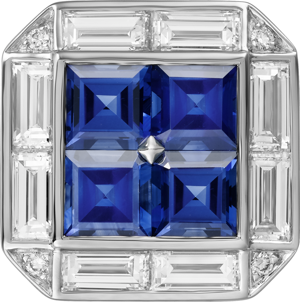 Cartier Héritage蓝宝石衬衫钉饰,18K镀铑白金,镶嵌16颗方形切割蓝宝石,32颗长梯形切割钻石和16颗圆形明亮式切割钻石,总重1.46克拉。尺寸:10 x 10 x 4毫米
