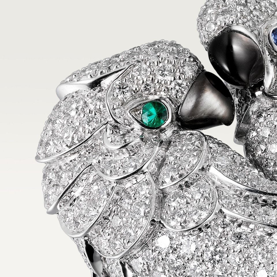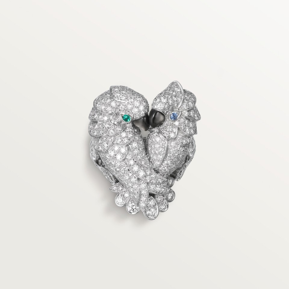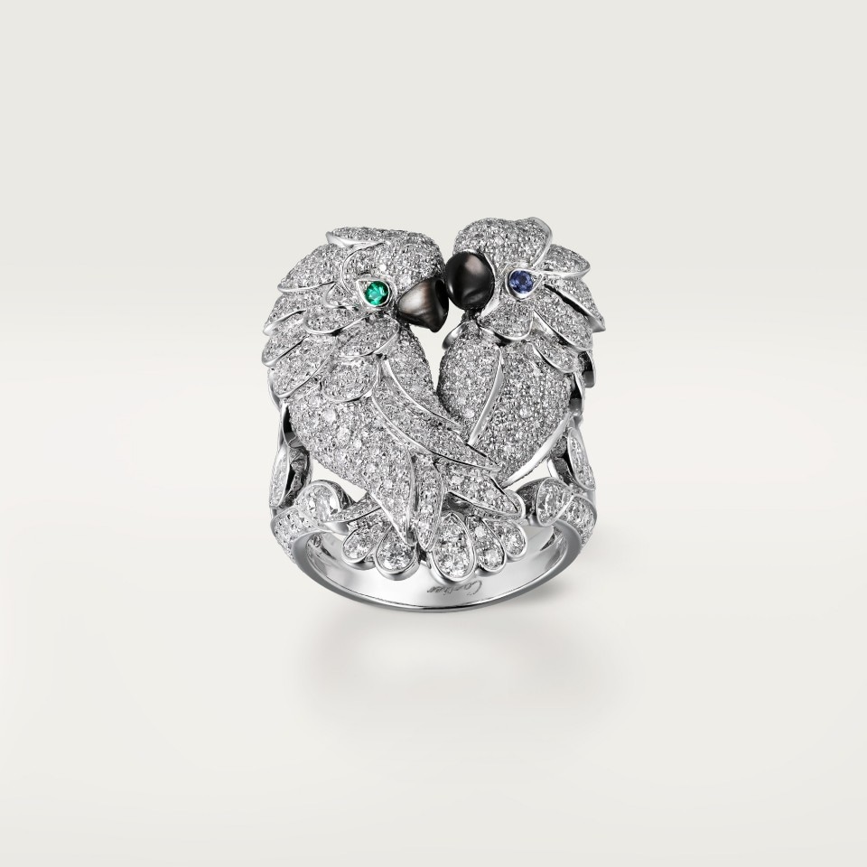 Les Oiseaux Libérés 戒指,750‰白金,灰色珍珠母贝,祖母绿,蓝宝石,镶嵌447颗圆形明亮式切割钻石,总重2.68克拉(适用尺寸:52)。