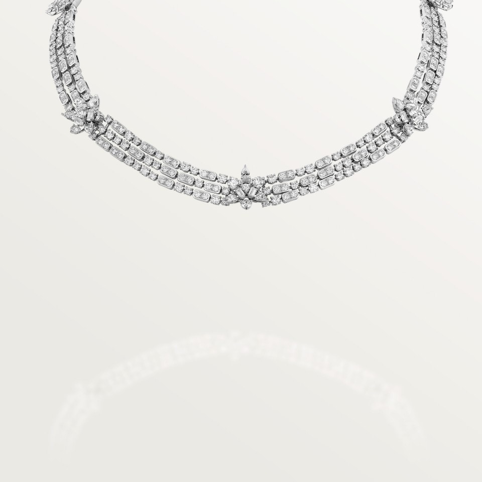 项链 - 750/1000白金,镶嵌18颗梨形钻石,总重2.24克拉,18颗长方形切割钻石,总重1.19克拉,314颗圆形明亮式切割钻石,总重17.56克拉。