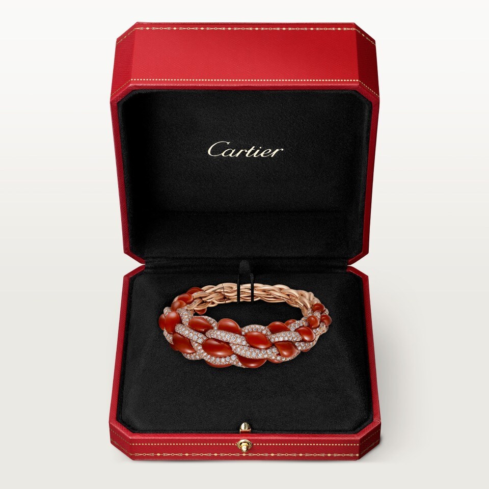 Tressage手链,750/1000玫瑰金,镶嵌珊瑚,637颗圆形明亮式切割钻石,总重13.65克拉(适用尺寸:17)。