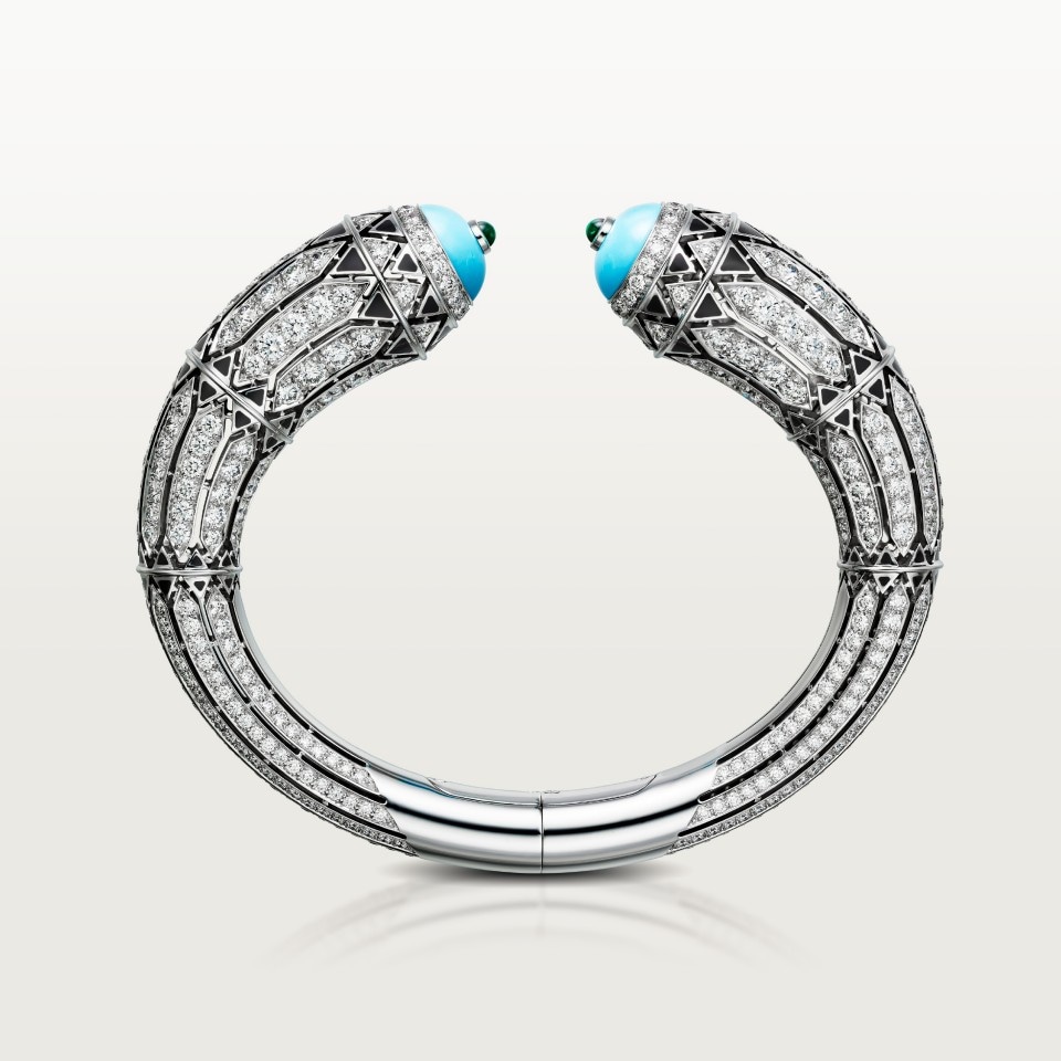 装饰艺术风格手镯,750‰白金,绿松石,凸圆形祖母绿,黑漆,540颗圆形明亮式切割钻石,总重12.73克拉。