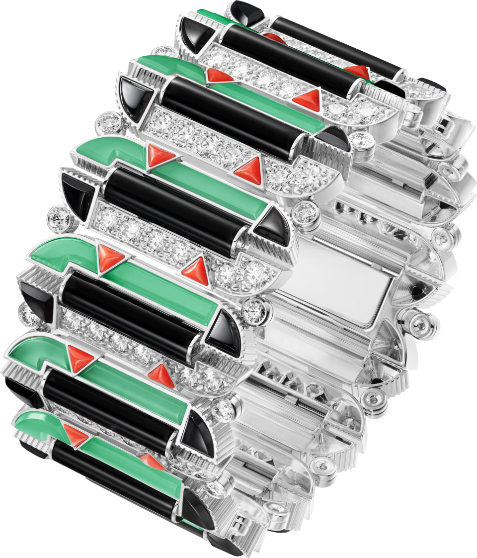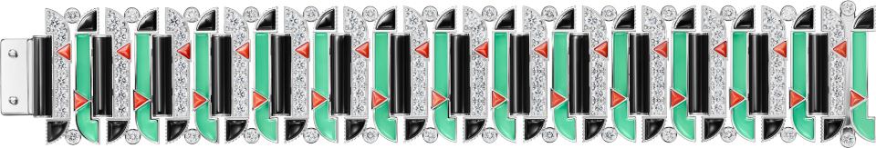 Géometrie & Contrastes手镯,750/1000白金,绿玉髓,缟玛瑙,珊瑚,镶嵌120颗圆形明亮式切割钻石,总重9.47克拉。宽度:29.7毫米(适用尺寸:17)。