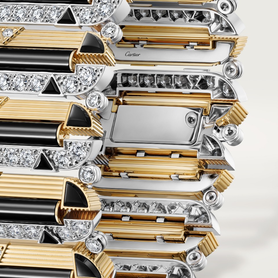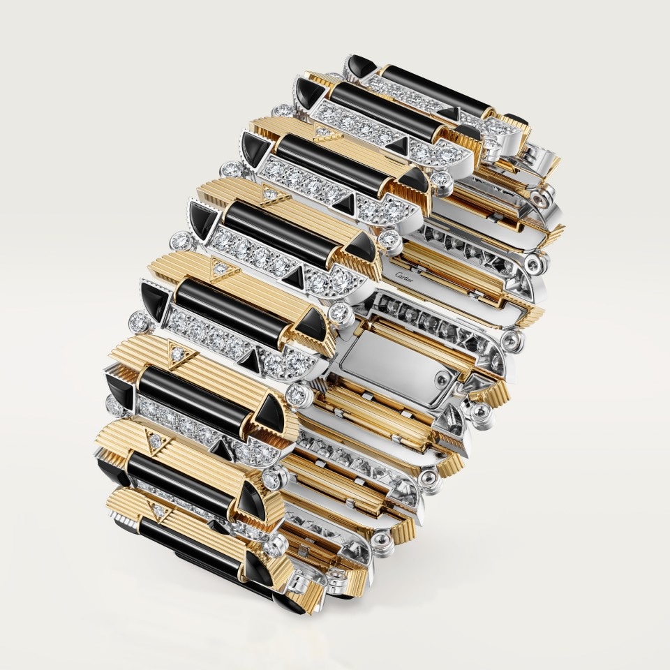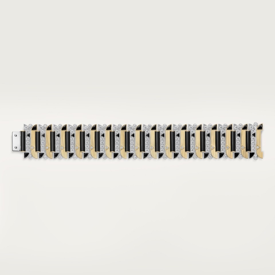 Géométrie & Contrastes手镯,750/1000白金,750/1000黄金,缟玛瑙,镶嵌135颗圆形明亮式切割钻石,总重9.84克拉。宽度:29.7毫米(适用尺寸:17)。