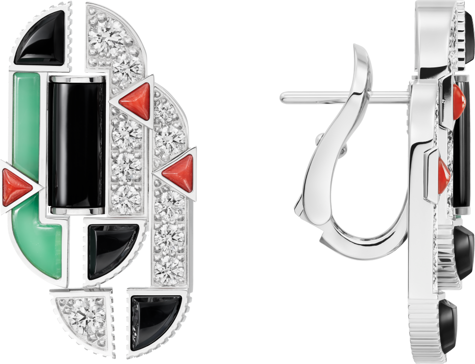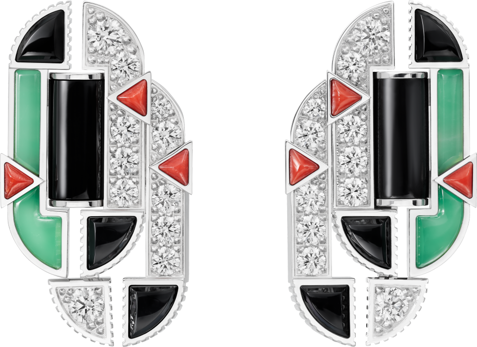 Géometrie & Contrastes耳环,750/1000白金,绿玉髓,缟玛瑙,珊瑚,每只耳环皆镶嵌22颗圆形明亮式切割钻石,总重0.82克拉。