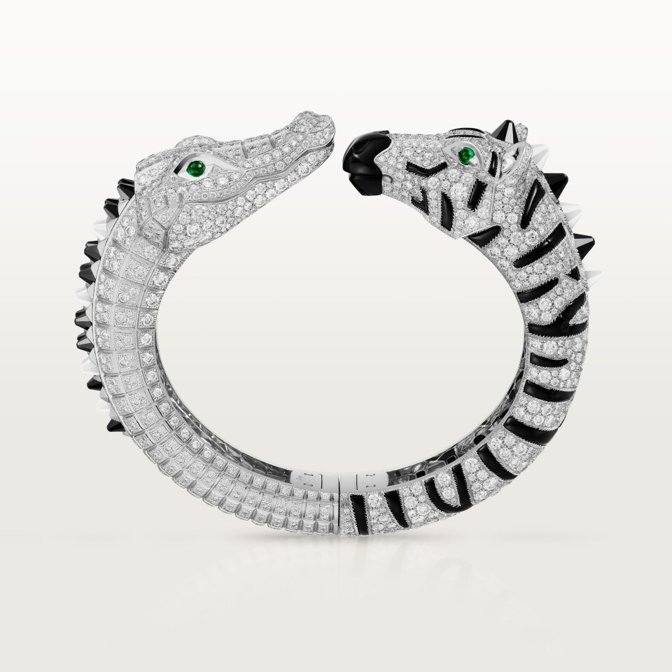 Indomptables de Cartier斑马与鳄鱼手镯,750/1000白金,镶嵌1302颗圆形明亮式切割钻石,总重14.77克拉,祖母绿,缟玛瑙(适用尺寸:17)。