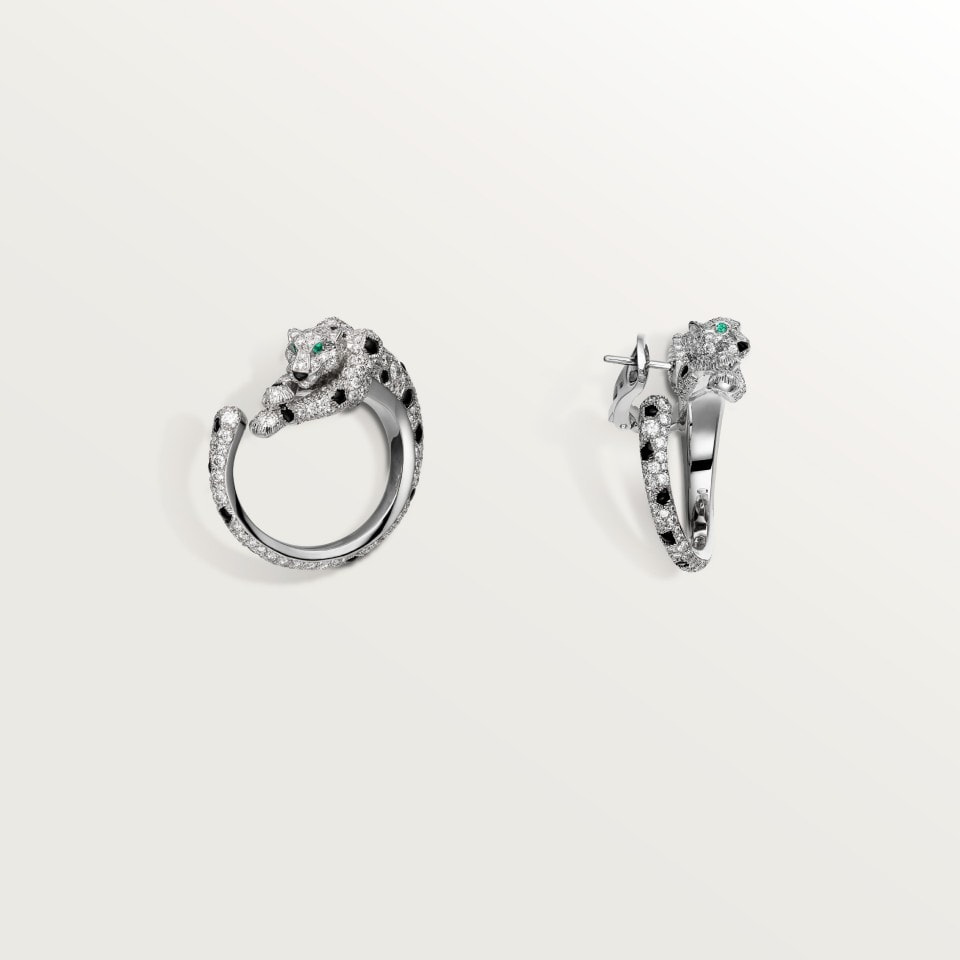 Panthère de Cartier环状耳环,750‰白金,每只耳环各镶嵌2颗祖母绿豹目,21颗缟玛瑙豹斑,1颗缟玛瑙豹鼻,239颗总重3.11克拉的钻石。