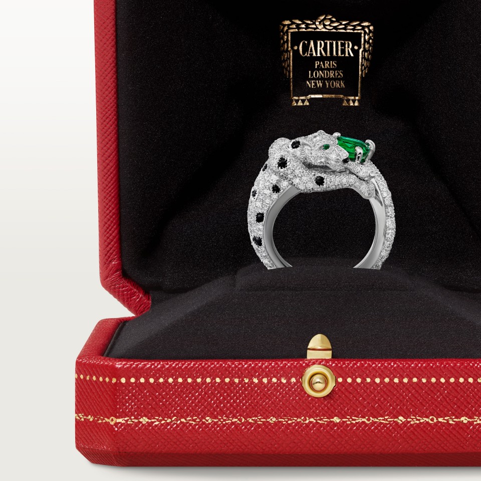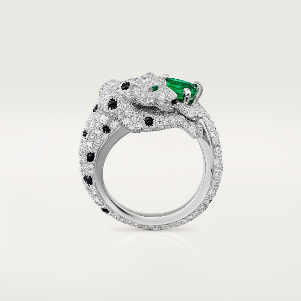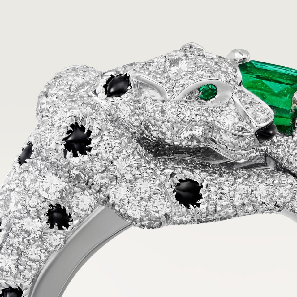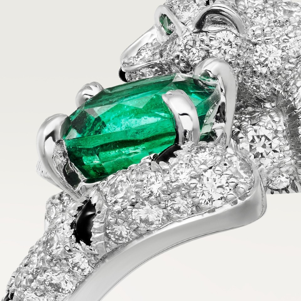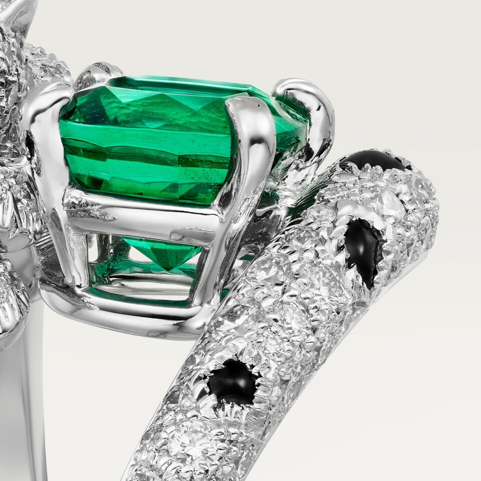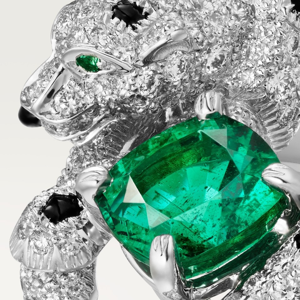 Panthère de Cartier戒指,750/1000白金,镶嵌1颗1.38克拉枕形切割祖母绿,2颗祖母绿豹目、22颗缟玛瑙豹斑、1颗缟玛瑙豹鼻,264颗总重1.84克拉的钻石。